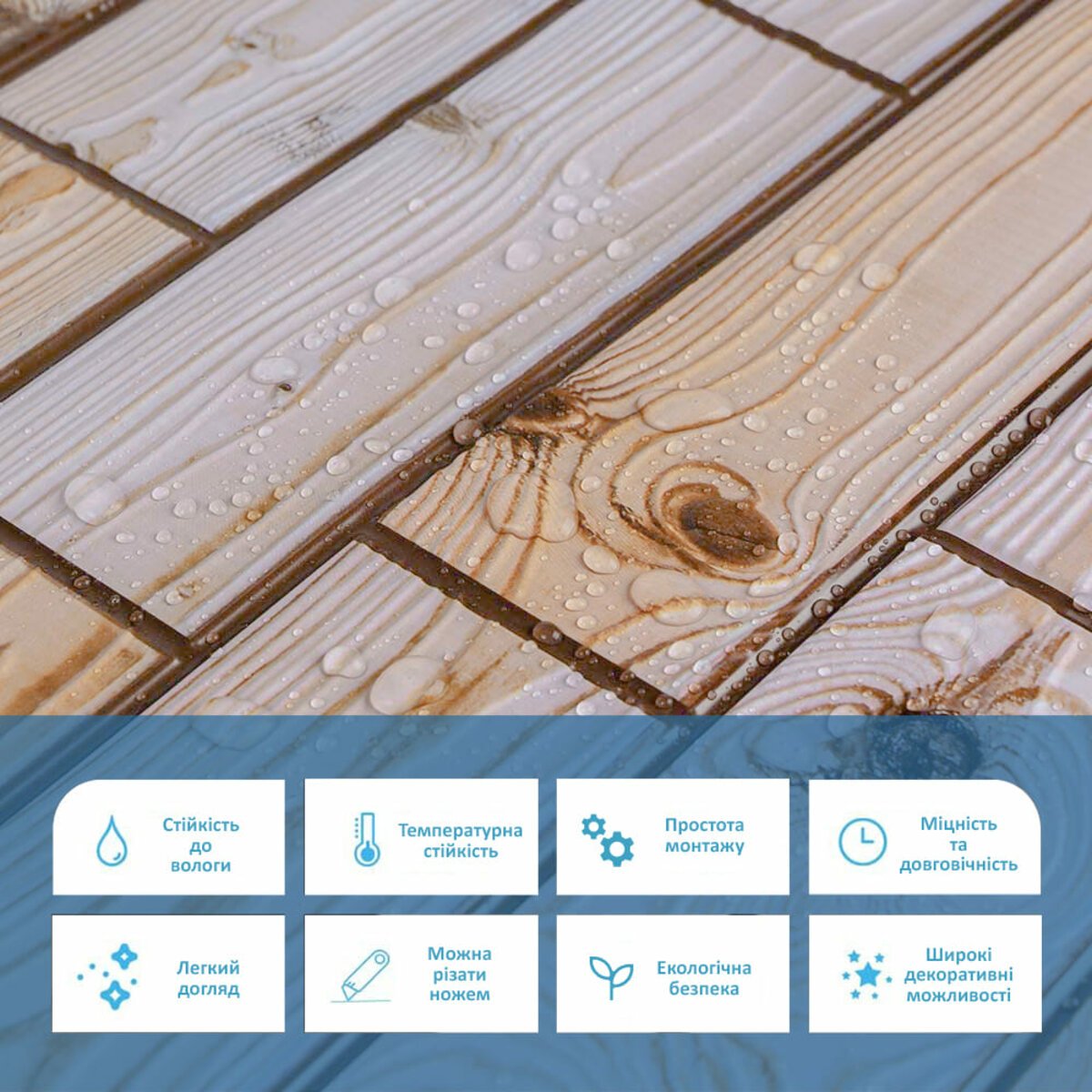 Панелі дуже прості у монтажі, практичні у використанні та довговічні. Для монтажу панелей Вам потрібен буде: клей для ПВХ, ножиці або монтажний ніж, рівень чи лінійка, скотч (для фіксації свіжих панелей).