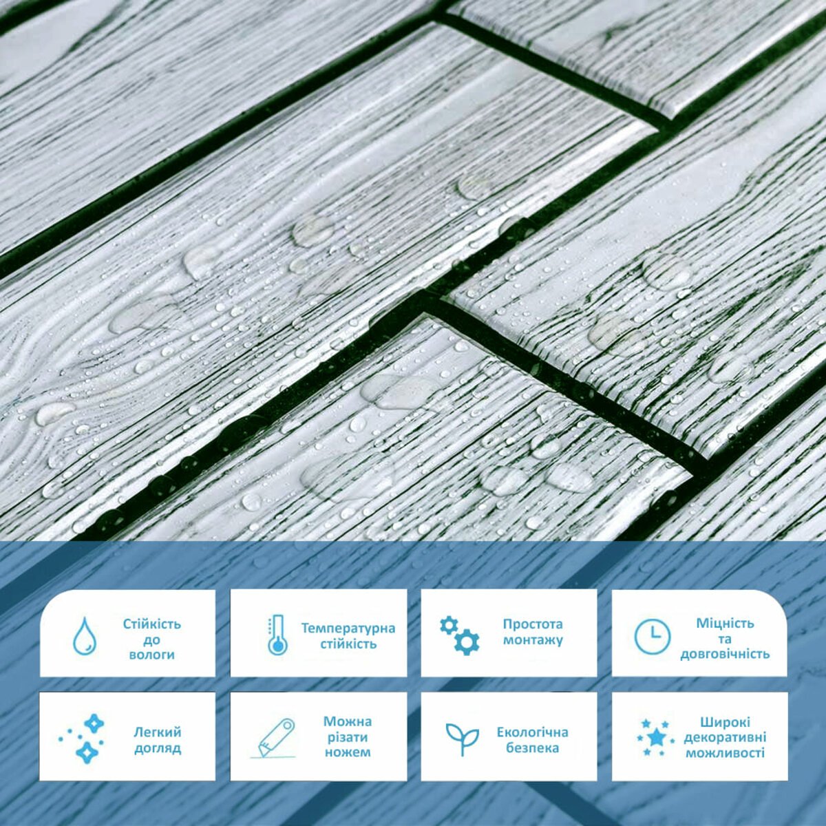 Панелі дуже прості у монтажі, практичні у використанні та довговічні. Для монтажу панелей Вам потрібен буде: клей для ПВХ, ножиці або монтажний ніж, рівень чи лінійка, скотч (для фіксації свіжих панелей).