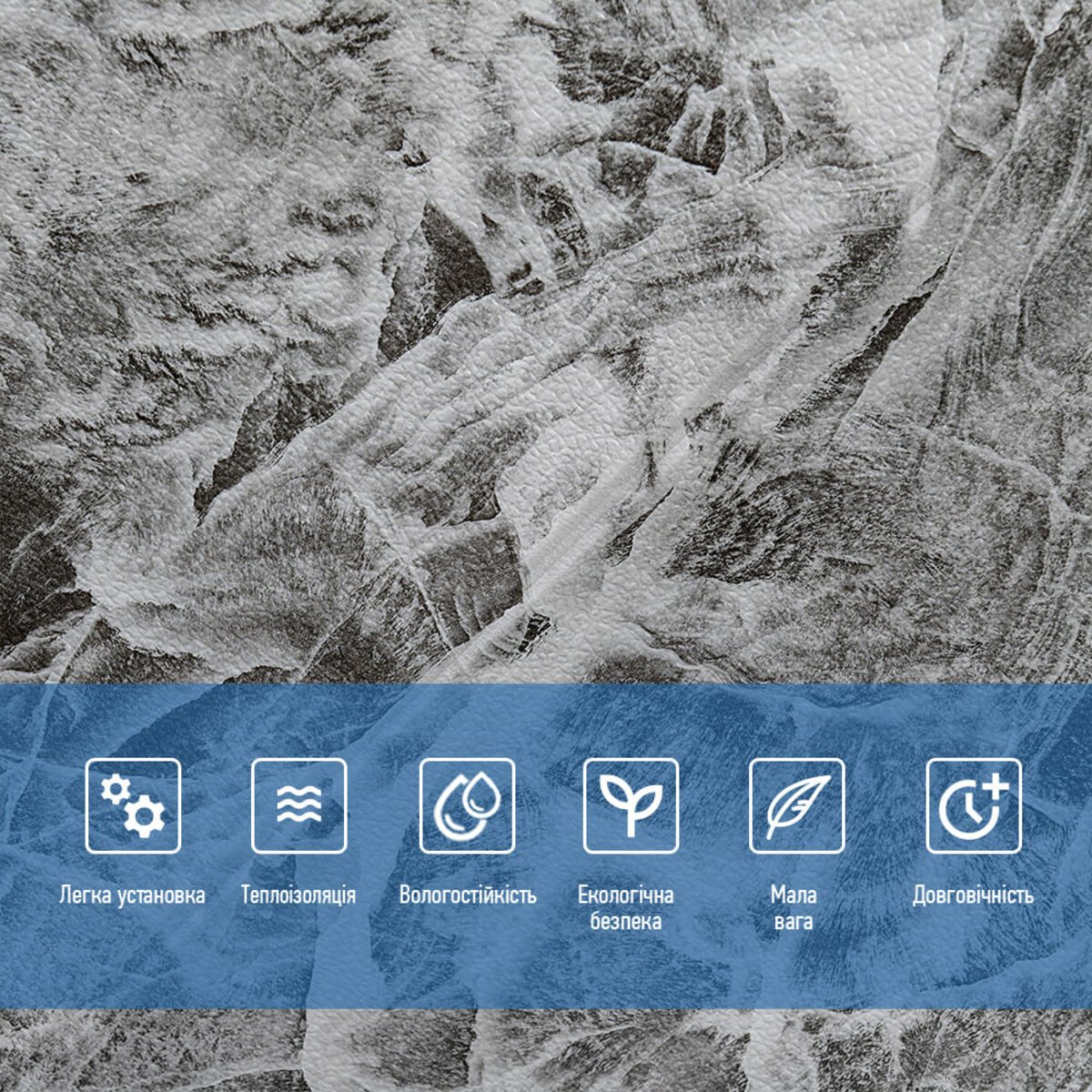 Декоративна панель під мармур виготовлена із спіненого поліпропілену. Це універсальний і щільний матеріал, але водночас легкий. Його термін служби понад 20 років. Самоклеючі 3D панелі з поліпропілену – це швидкий ремонт з мінімумом шуму та будівельного сміття.