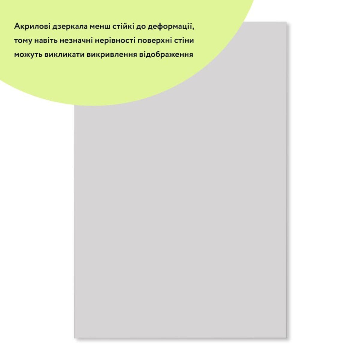 Дзеркало акрилове на клейовій основіАкрилове дзеркало є легким та ударостійким декоративним метеріалом. Виготовляється з високоякісного акрилу, який забезпечує стійкість до пошкоджень. Широко застосовуються в дизайні інтер’єру, виставкових стендах, торговому обладнанні та інших областях, де важливі легкість та безпека матеріалу.