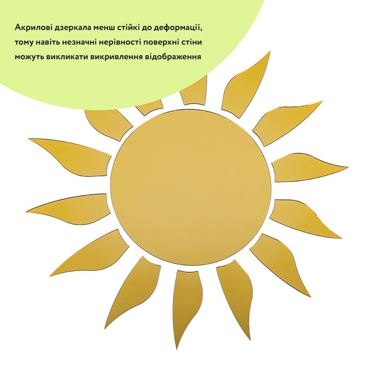• Дзеркальний шар: це тонке металізоване або полімерне покриття, яке наноситься на акрилову основу та створює ефект дзеркального відбиття. Воно має гладку, світловідбивну поверхню, стійку до вологи та зношування. Завдяки гнучкості матеріалу відображення може незначно викривлюватися.