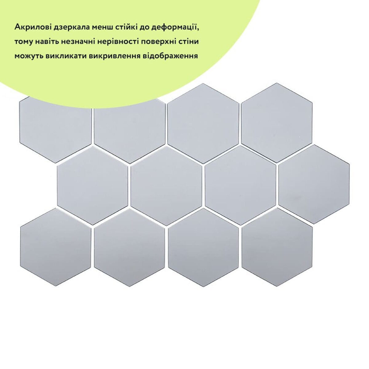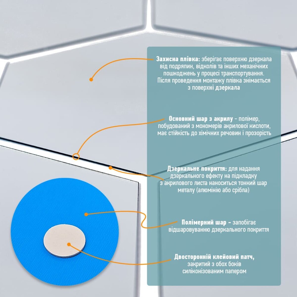 - Дзеркальний шар: це тонке металізоване або полімерне покриття, яке наноситься на акрилову основу та створює ефект дзеркального відбиття. Воно має гладку, світловідбивну поверхню, стійку до вологи та зношування. Завдяки гнучкості матеріалу відображення може незначно викривлюватися.