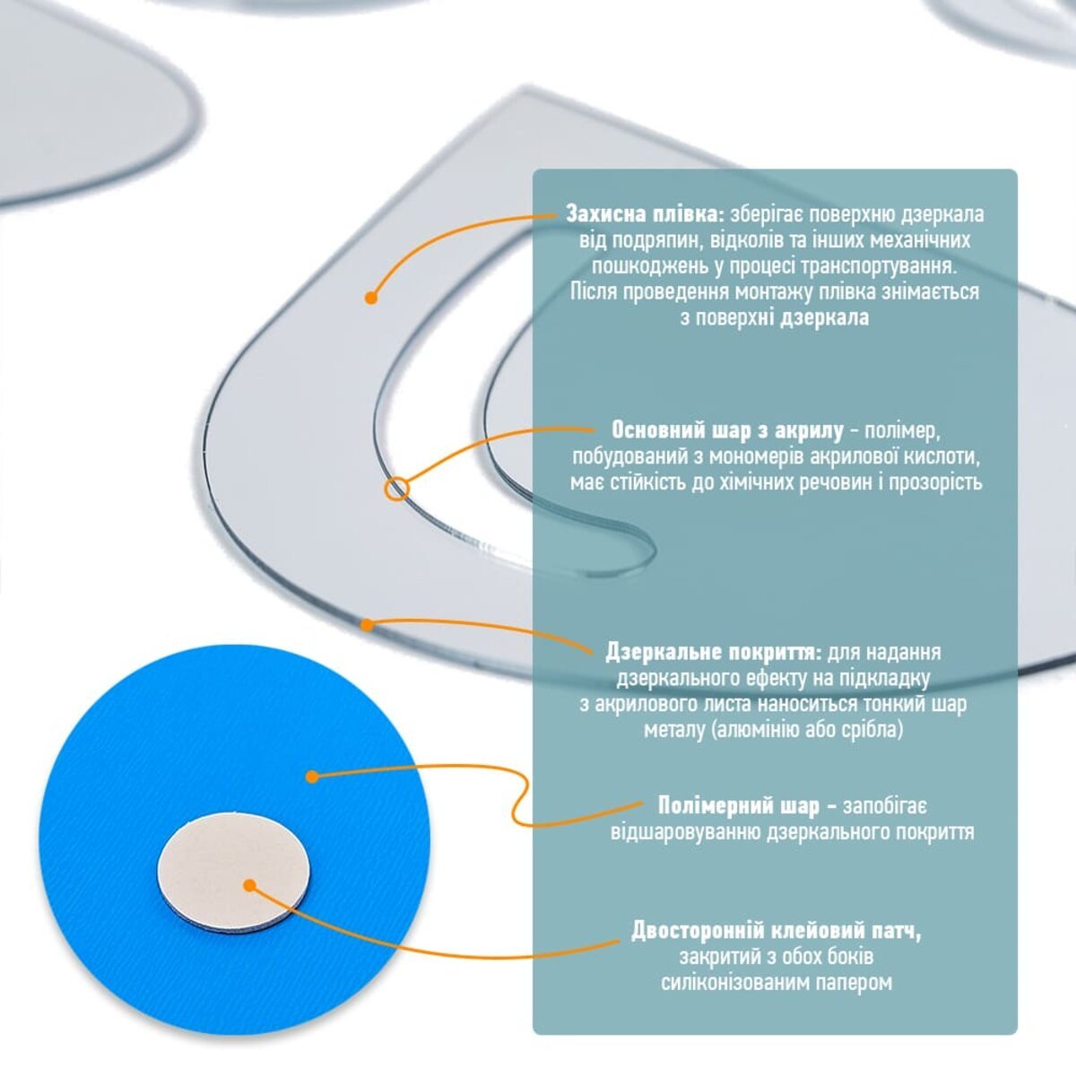 • Дзеркальний шар: це тонке металізоване або полімерне покриття, яке наноситься на акрилову основу та створює ефект дзеркального відбиття. Воно має гладку, світловідбивну поверхню, стійку до вологи та зношування. Завдяки гнучкості матеріалу відображення може незначно викривлюватися.
