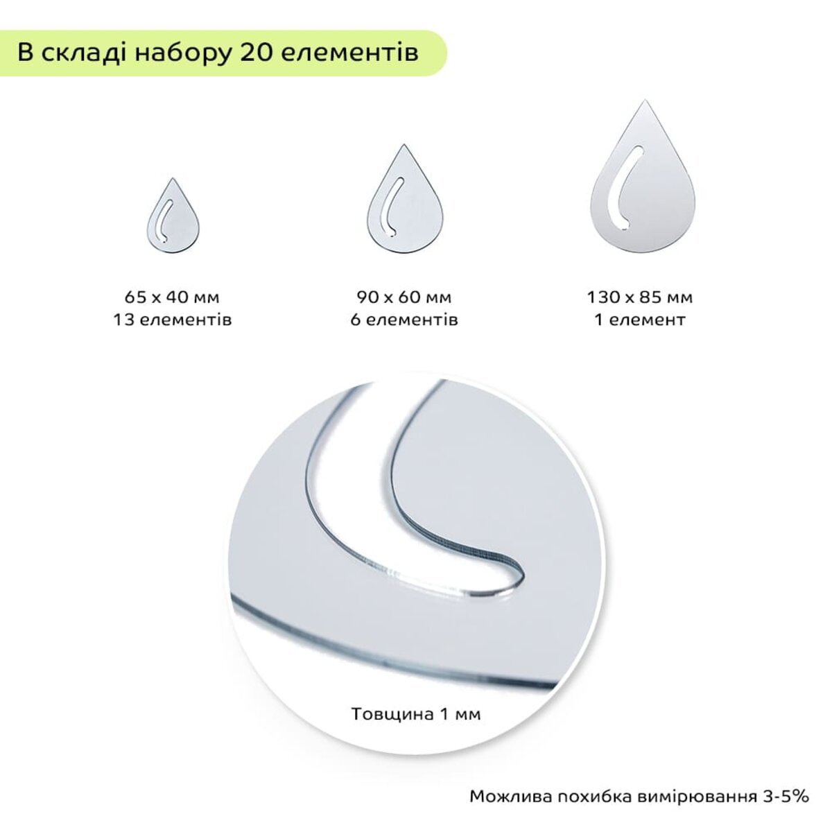 Розміри:20шт., товщина 1мм, 130х85мм – 1шт., 90х60мм – 6шт., 65х40мм – 13шт,можлива похибка розміру 3-5%