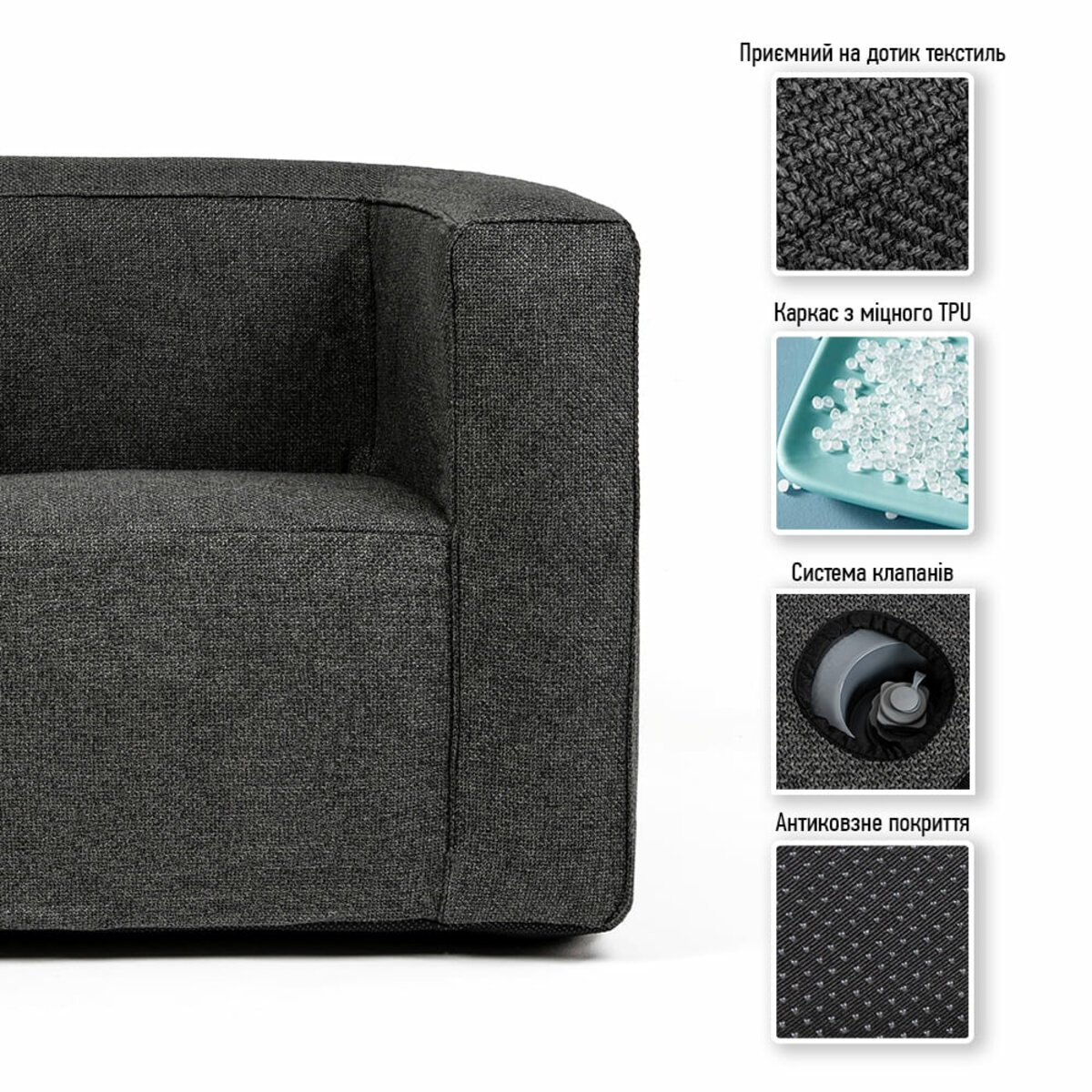 Антиковзне покриття. На нижній частині надувних меблів, які контактують із підлогою, використовується антиковзне покриття, яке створене завдяки гумовим точок з термопластичної гуми (TPR). Це покриття ефективно запобігає ковзанню меблів на різних поверхнях, забезпечуючи стабільність та безпеку під час використання.