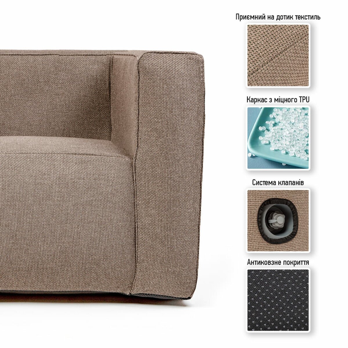 Надувний каркас меблів виготовлений з TPU – це високоякісний термопластичний поліуретан, який відрізняється своєю міцністю, еластичністью та стійкістю до механічних пошкоджень. Він має молекулярну структуру, яка дозволяє йому бути одночасно гнучким та довговічним. TPU стійкий до жирів та олій, ультрафіолетового випромінювання та погодних умов, що робить його ідеальним для використання на відкритому повітрі. Матеріал також має високу стійкість до зносу та проникнення води. Робоча температура TPU коливається від -40°C до 80°C, при цьому зберігає свої властивості без значних змін у розмірі.