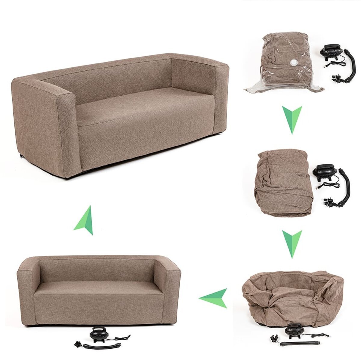 2. Зберігання: Після використання надувні меблі потрібно здути для зручності зберігання. Зберігайте меблі в сухому, добре провітрюваному приміщенні. Для додаткового захисту від пилу та пошкоджень помістіть меблі в компресійний пакет.