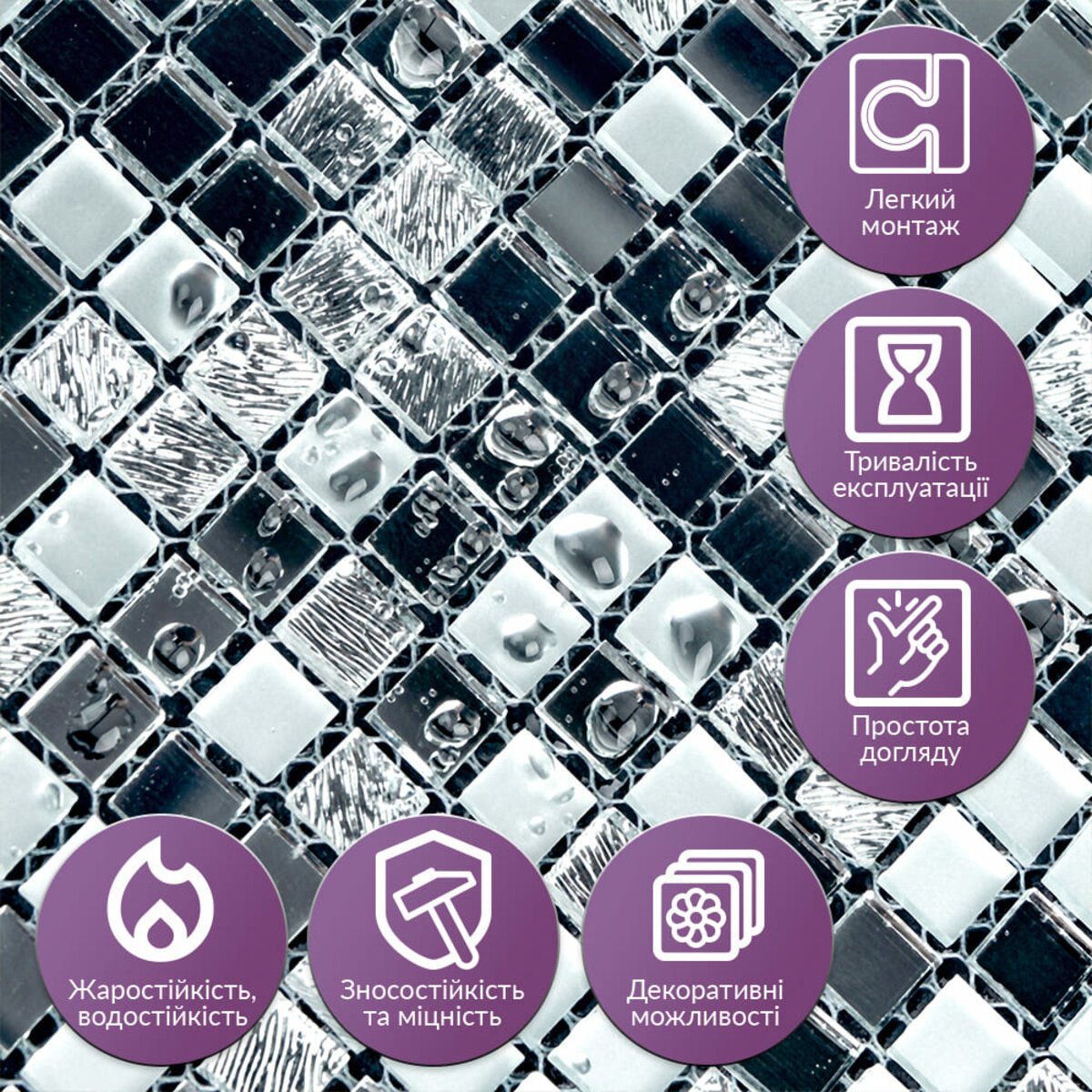 Простота догляду: Мозаїка легко миється і не потребує спеціальних засобів для очищення, що спрощує її підтримання у належному стані. Вона не вбирає бруд і залишається чистою навіть у приміщеннях з високою вологістю та частим використанням.