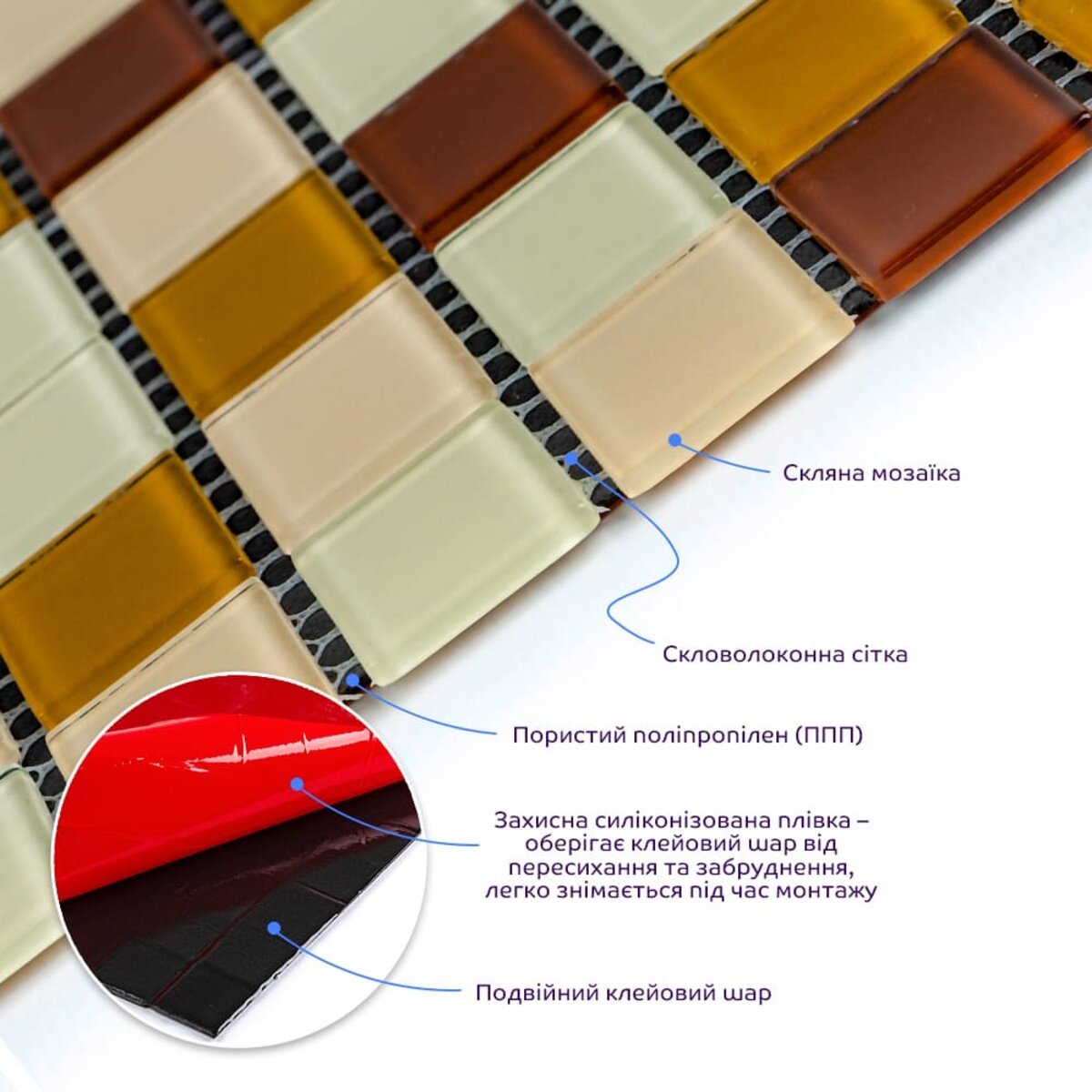 • Водостійкість та жаростійкість: Скляна мозаїка на клейовій основі стійка до впливу вологи та температурних перепадів, що робить її ідеальним вибором для ванних кімнат, кухонь і душових кабін. Покриття запобігає утворенню плісняви, забезпечуючи довговічність та безпеку використання у вологих приміщеннях.