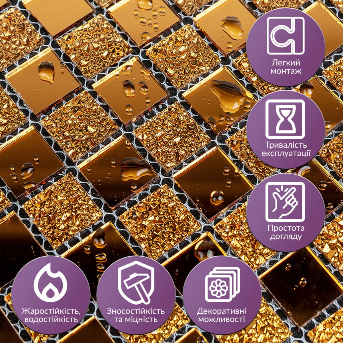 Простота догляду: Мозаїка легко миється і не потребує спеціальних засобів для очищення, що спрощує її підтримання у належному стані. Вона не вбирає бруд і залишається чистою навіть у приміщеннях з високою вологістю та частим використанням.