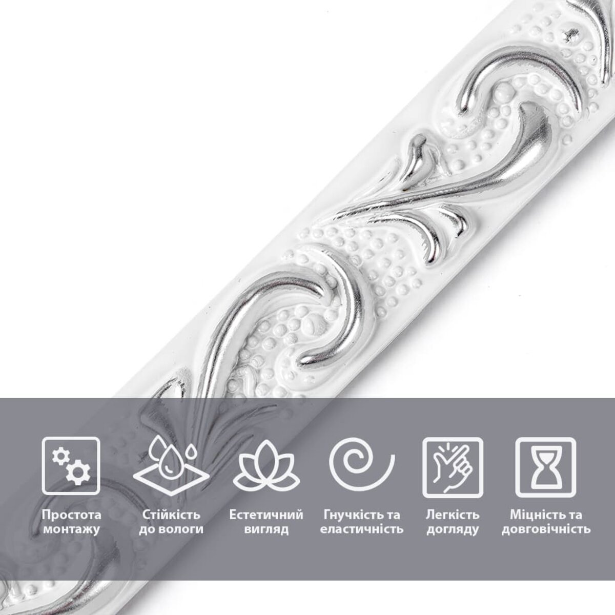 Гнучкість та еластичність: завдяки високій гнучкості молдинг щільно повторює контури навіть вигнутих або нерівних поверхонь, не утворюючи складок чи тріщин.