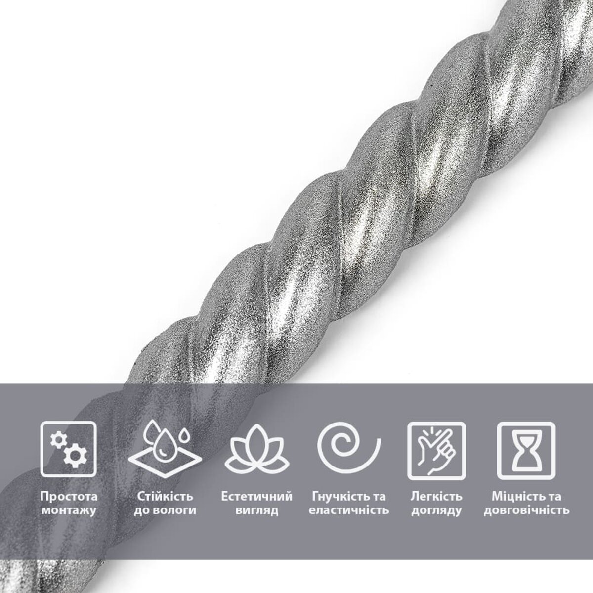 • Гнучкість та еластичність: завдяки високій гнучкості молдинг щільно повторює контури навіть вигнутих або нерівних поверхонь, не утворюючи складок чи тріщин.