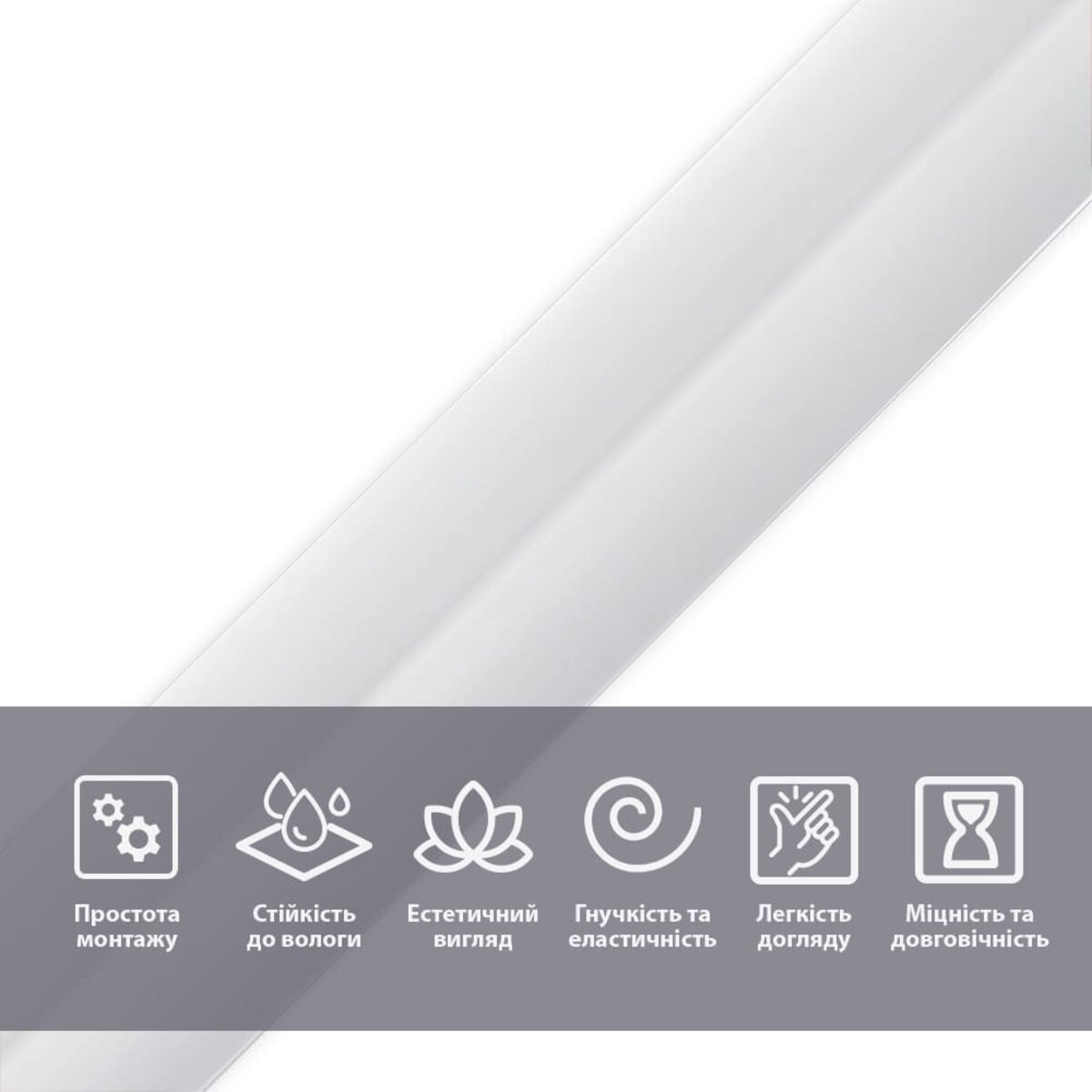 Гнучкість та еластичність: завдяки високій гнучкості молдинг щільно повторює контури навіть вигнутих або нерівних поверхонь, не утворюючи складок чи тріщин.