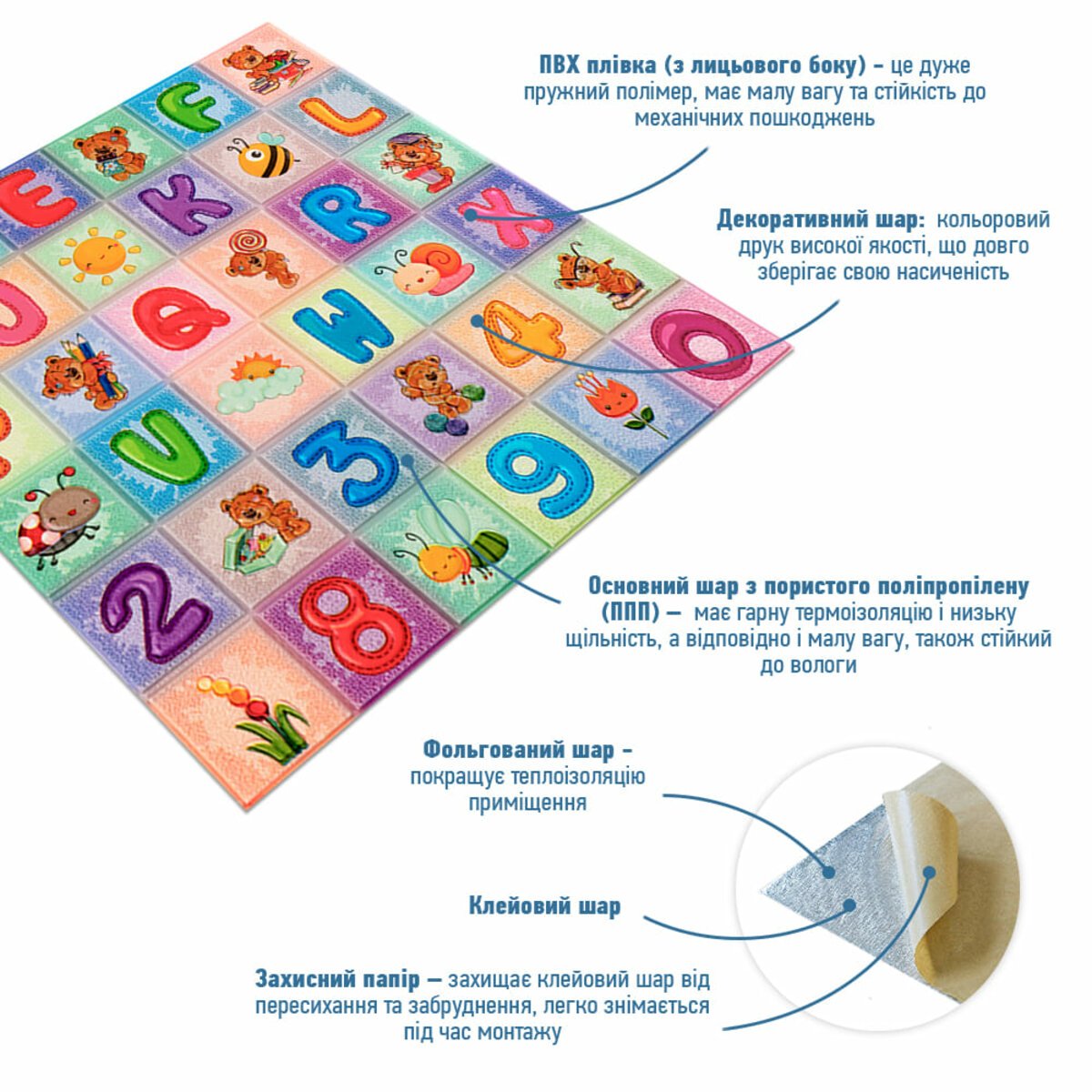 - Захисний папір – оберігає клейовий шар від пересихання та забруднення, легко знімається під час монтажу.