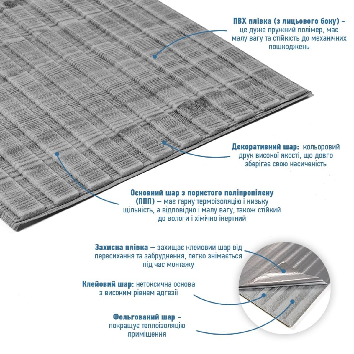 - Захисний папір – оберігає клейовий шар від пересихання та забруднення, легко знімається під час монтажу.
