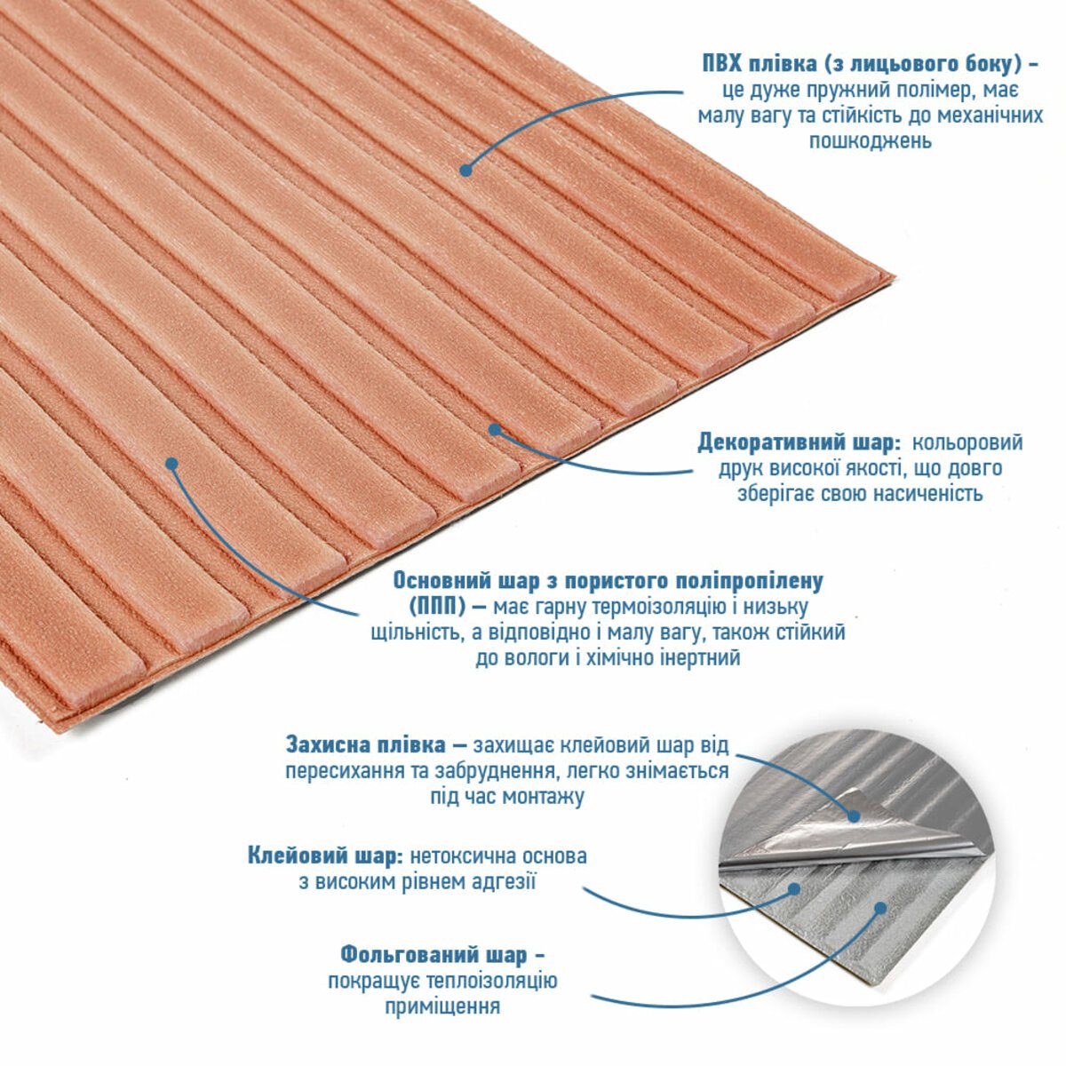 - Легкість монтажу: наявність клейового шару дозволяє встановити панелі без необхідності застосування додаткових матеріалів.