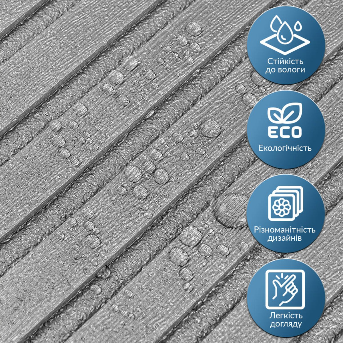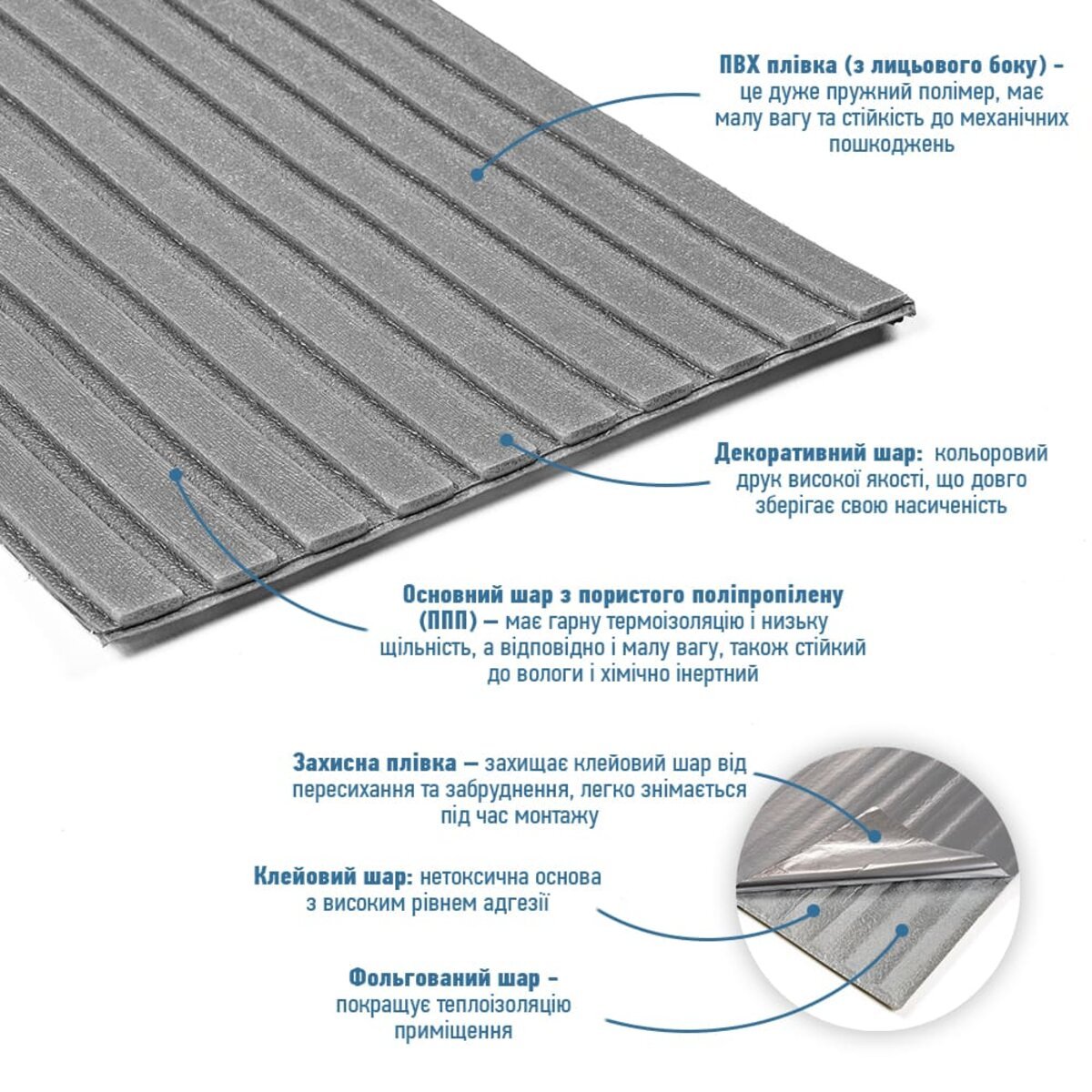 - Легкість монтажу: наявність клейового шару дозволяє встановити панелі без необхідності застосування додаткових матеріалів.