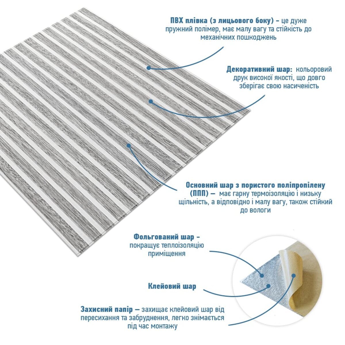 5. Захисний папір – оберігає клейовий шар від пересихання та забруднення, легко знімається під час монтажу.