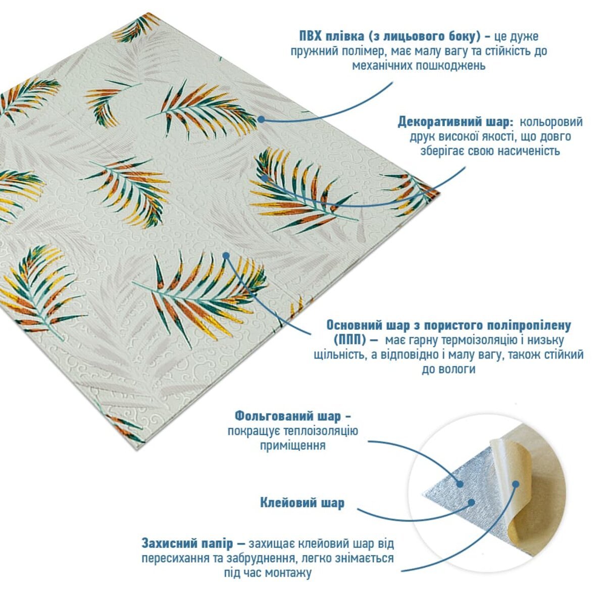 - Захисний папір – оберігає клейовий шар від пересихання та забруднення, легко знімається під час монтажу.