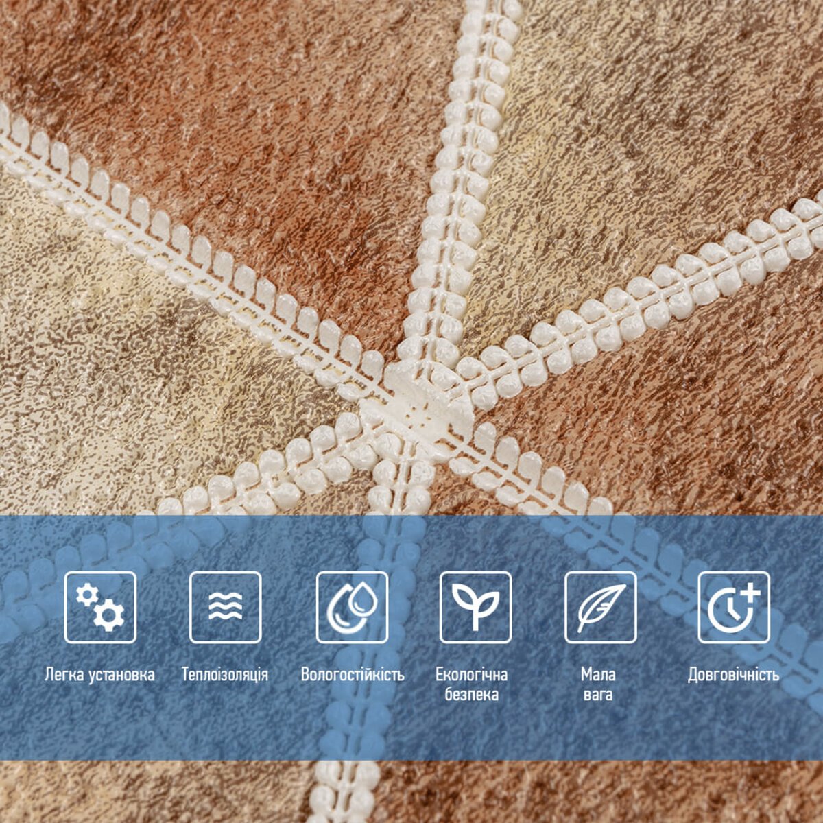 - Легкість монтажу: наявність клейового шару дозволяє встановити панелі без необхідності застосування додаткових матеріалів.