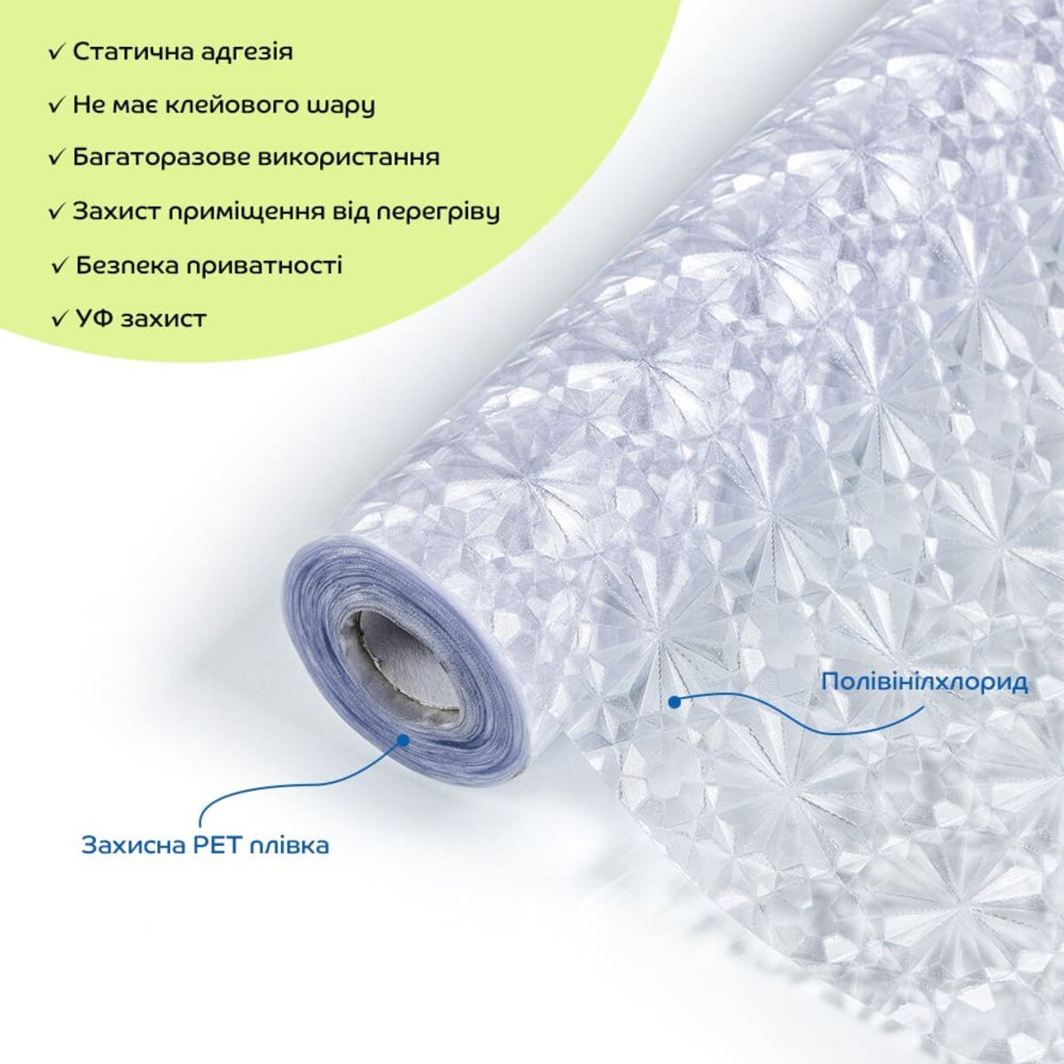 Віконна ПВХ плівка не має клейового шару та кріпиться за допомогою води, працює за принципом статичної адгезії. Це означає, що плівка тримається на поверхні вікна завдяки статичній електриці і щільному приляганню до скла. Вода допомагає забезпечити краще зчеплення між плівкою і склом, зменшуючи кількість бульбашок повітря під плівкою.
