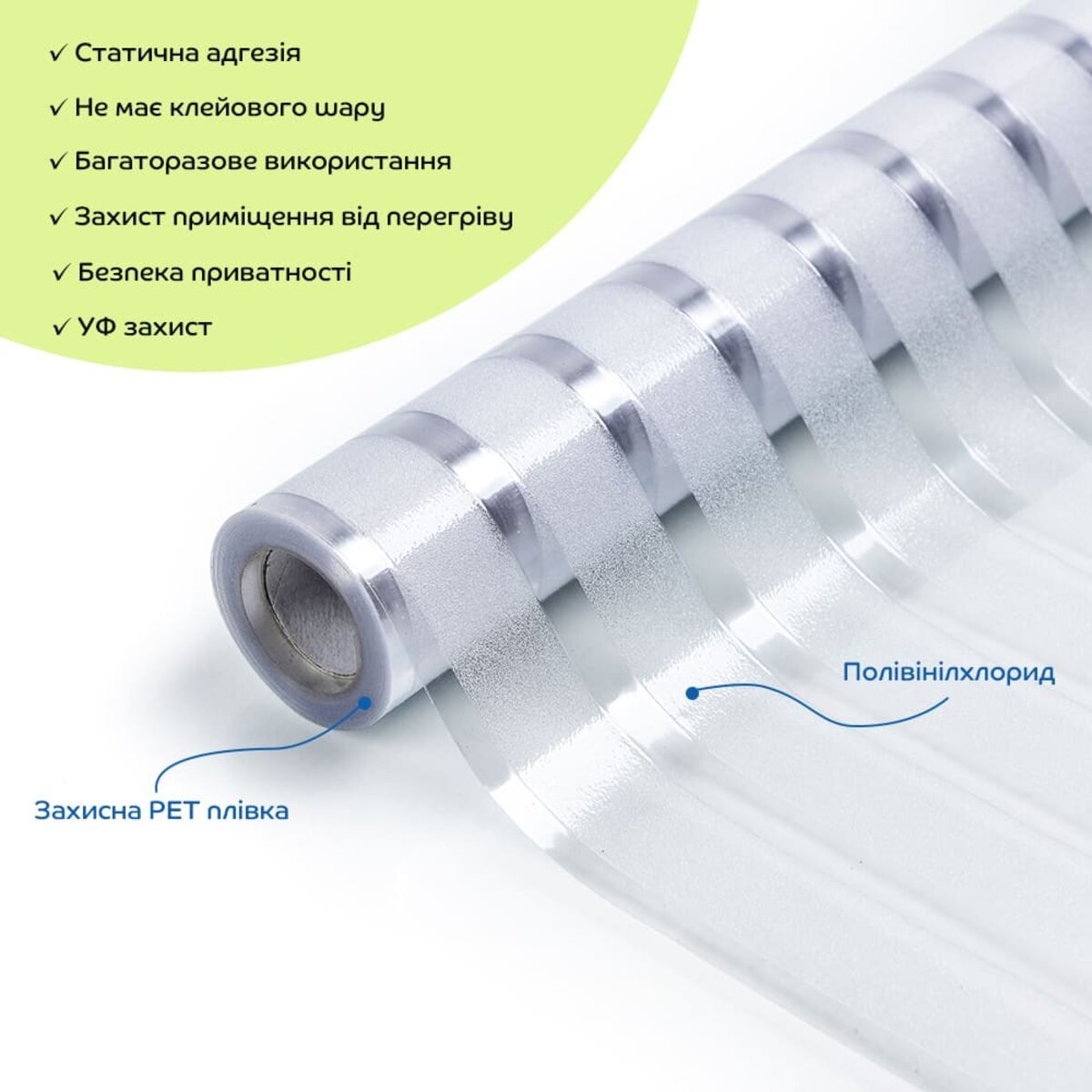 • Універсальність та легкість в монтажі: ПВХ плівки можна легко різати ножицями або монтажним ножем, що дозволяє використовувати їх у різних місцях: на вікнах, розсувних дверях, кухонних шафах та інших скляних поверхнях.
