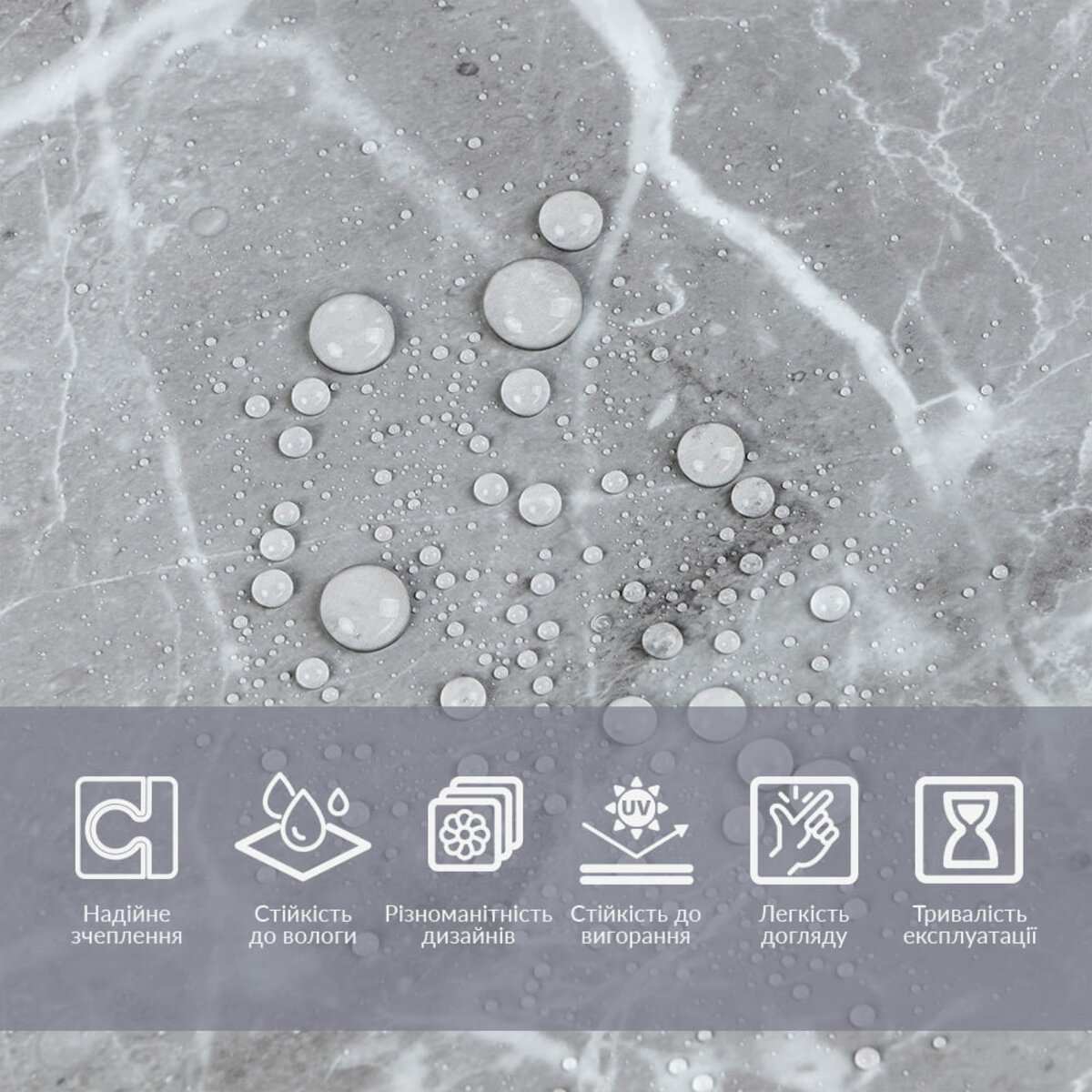 • Вологостійкість: завдяки ламінації, плівка має підвищену стійкість до вологи, що робить її ідеальною для використання у приміщеннях з підвищеною вологістю, таких як кухня чи ванна кімната.