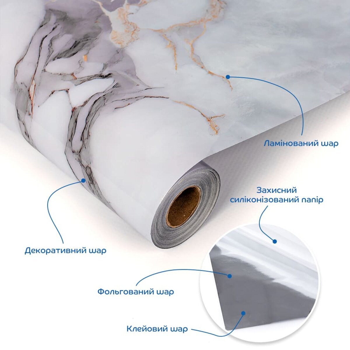 • Декоративний шар. Під ламінацією знаходиться шар з декоративним друком, на якому зображено малюнок або текстура, що імітують дерево, мармур, плитку чи інші матеріали. Цей шар надає плівці візуальну привабливість, що підходить для різноманітних інтер’єрних рішень.