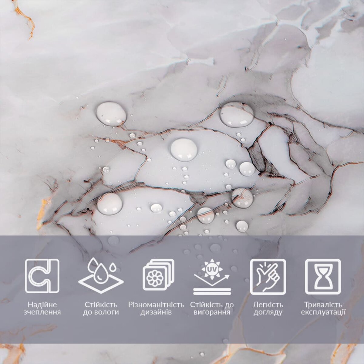 • Вологостійкість: завдяки ламінації, плівка має підвищену стійкість до вологи, що робить її ідеальною для використання у приміщеннях з підвищеною вологістю, таких як кухня чи ванна кімната.