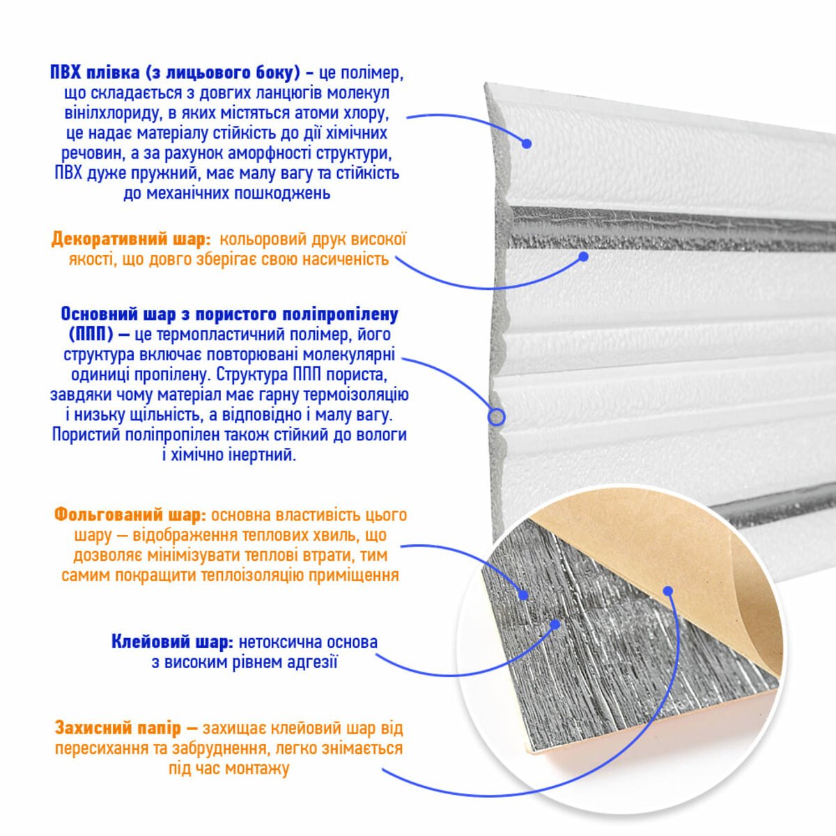 • Стійкість до води та хімічних речовин: пористий поліпропілен має гарну стійкість до вологи, це дає можливість застосовувати його приміщення з підвищеною вологістю, а завдяки захисній ПВХ плівці, панель можна бути побутовими миючими засобами (без використання щітки з високою абразивною здатністю).