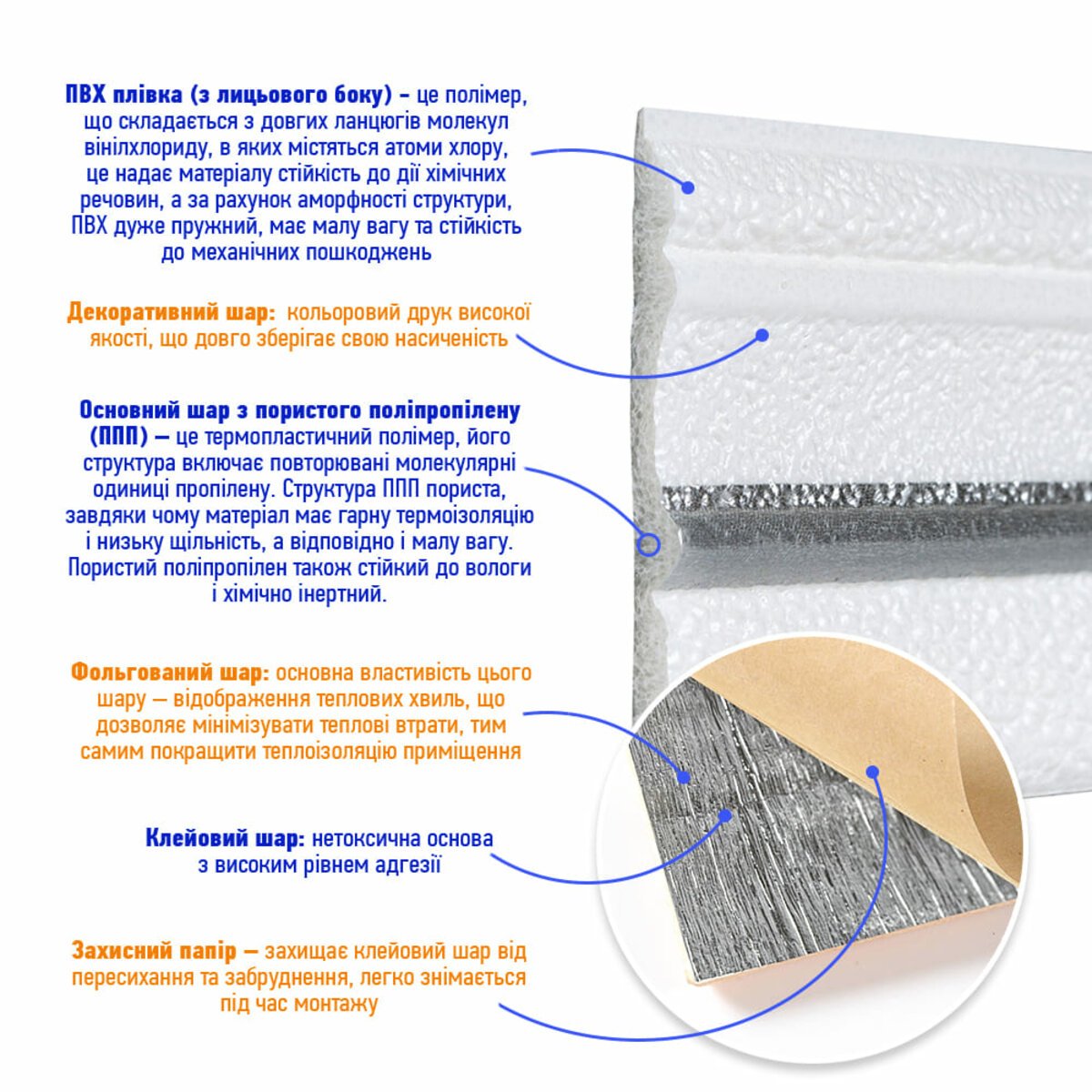 - Декоративний шар: кольоровий друк високої якості, що довго зберігає свою насиченість.