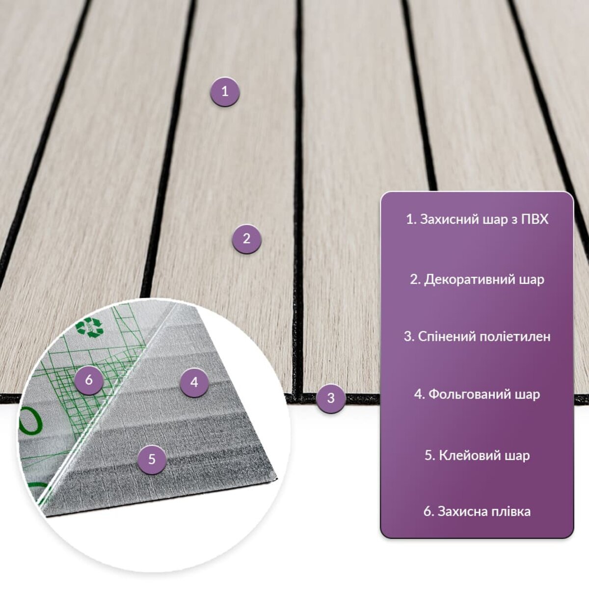 • Декоративний шар: плівка з кольоровим друком високої роздільної якості, яка повністю імітує фактуру природних матеріалів завдяки чіткому та деталізованому зображенню.