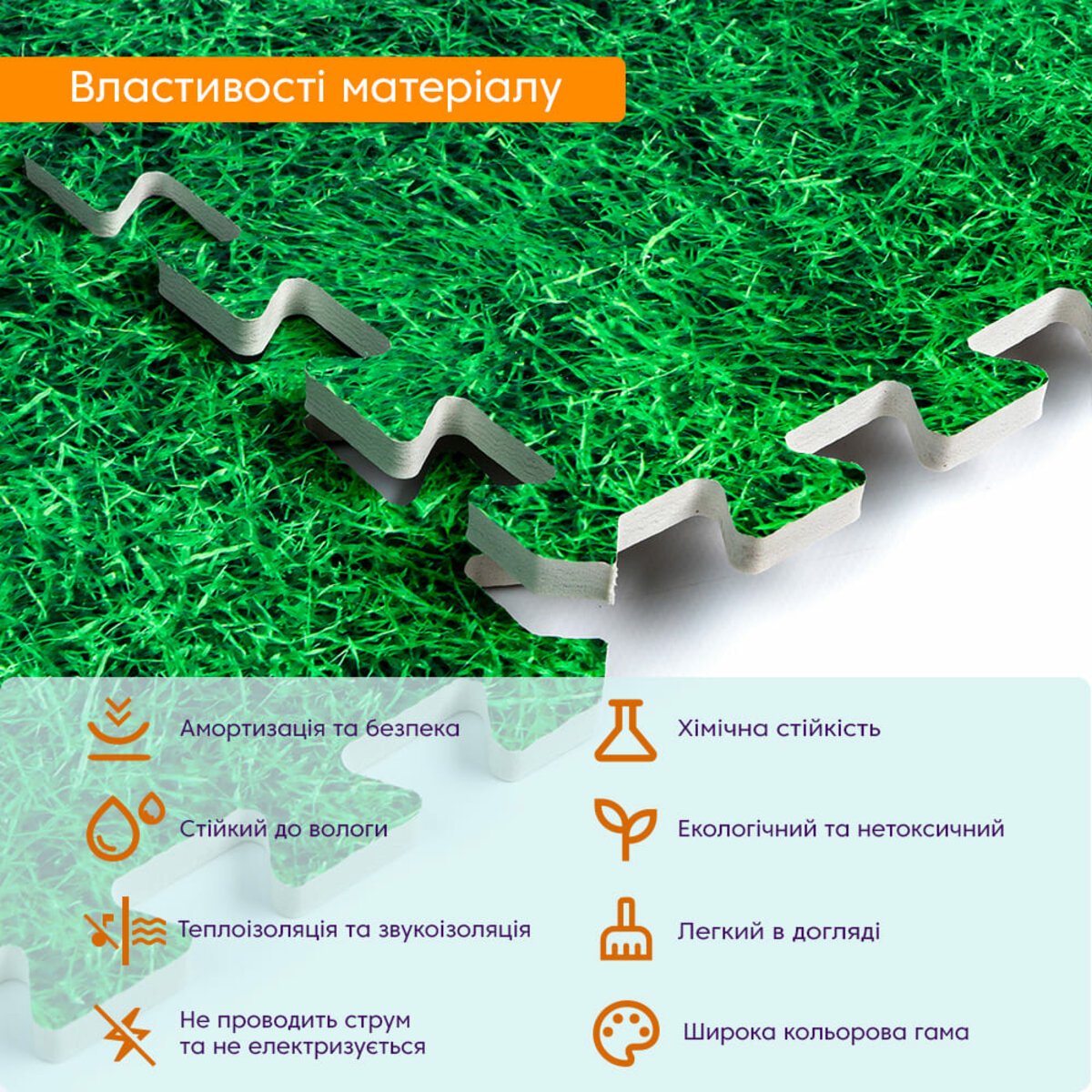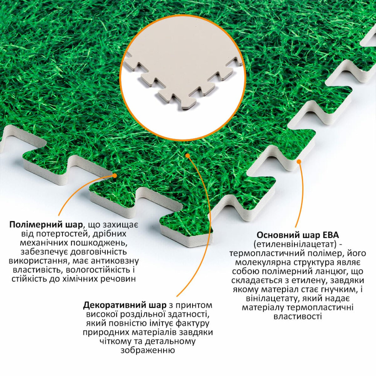 Покриття підлогове модульне «Пазл» являє собою модульні плити з вирізаними замками, які легко з’єднуються між собою, утворюючи стійке і міцне покриття.Замки знімаються.Ключові характеристики підлогового покриття:
