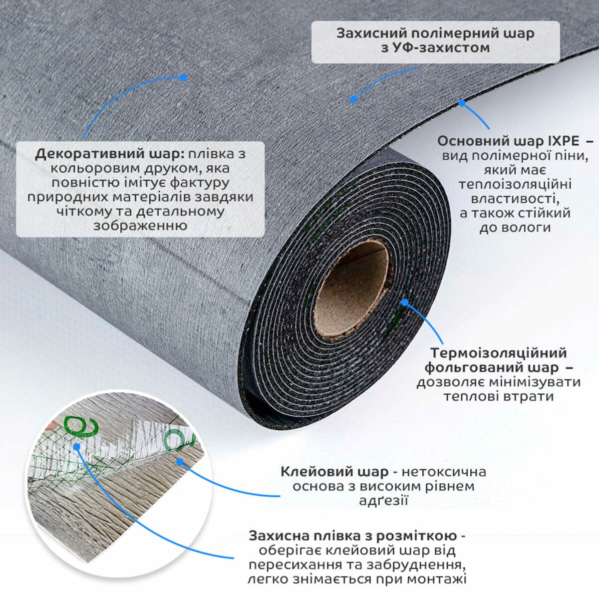 - Термоізоляційний фольгований шар: основна властивість цього шару – відображення теплових хвиль, що дозволяє мінімізувати теплові втрати, тим самим покращити теплоізоляцію приміщення.