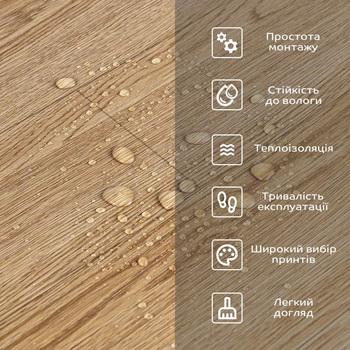 1. Захисний полімерний шар (0,3 мм) захищає від потертостей та дрібних механічних пошкоджень, забезпечує довговічність використання, а УФ- захист допомагає запобігти вигоранню, зберігаючи колір насиченим, внаслідок чого покриття підлоги довго має свій початковий естетичний вигляд.