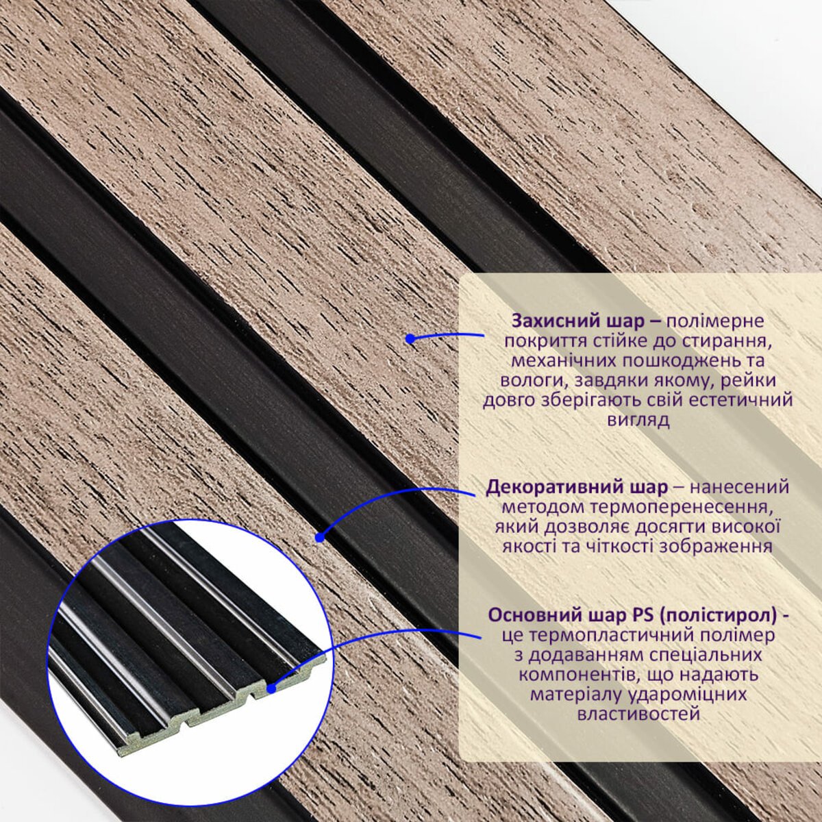 - Захисний шар – полімерне покриття стійке до стирання, механічних пошкоджень та вологи, завдяки якому, рейки довго зберігають свій естетичний вигляд.