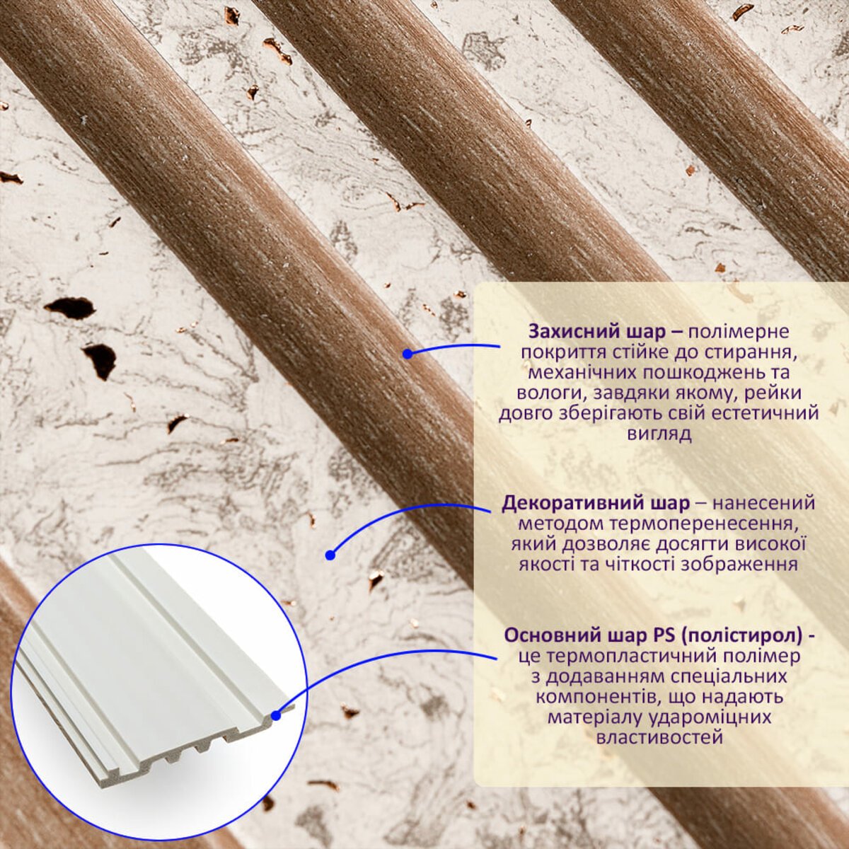 - Захисний шар – полімерне покриття стійке до стирання, механічних пошкоджень та вологи, завдяки якому, рейки довго зберігають свій естетичний вигляд.