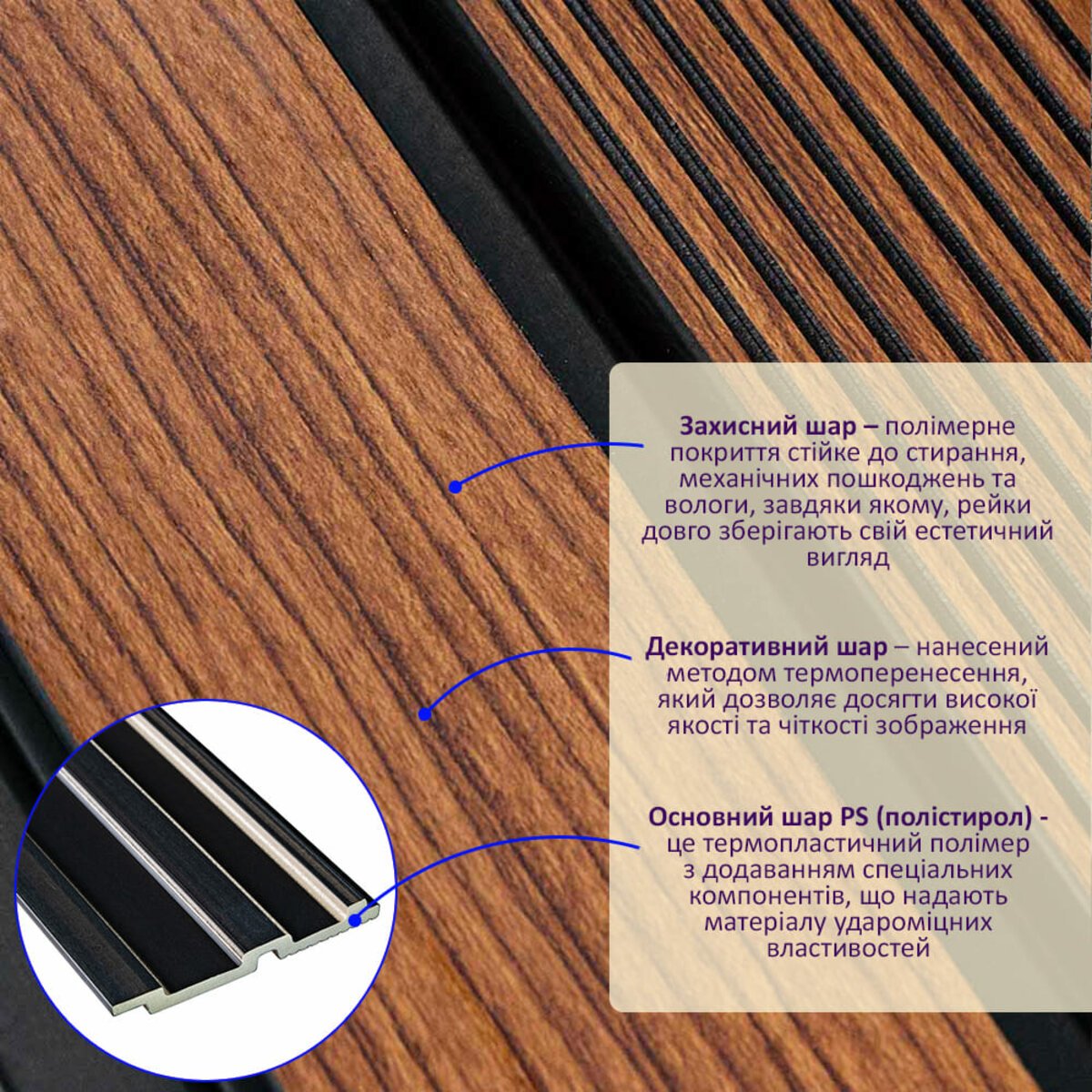 - Захисний шар – полімерне покриття стійке до стирання, механічних пошкоджень та вологи, завдяки якому, рейки довго зберігають свій естетичний вигляд.