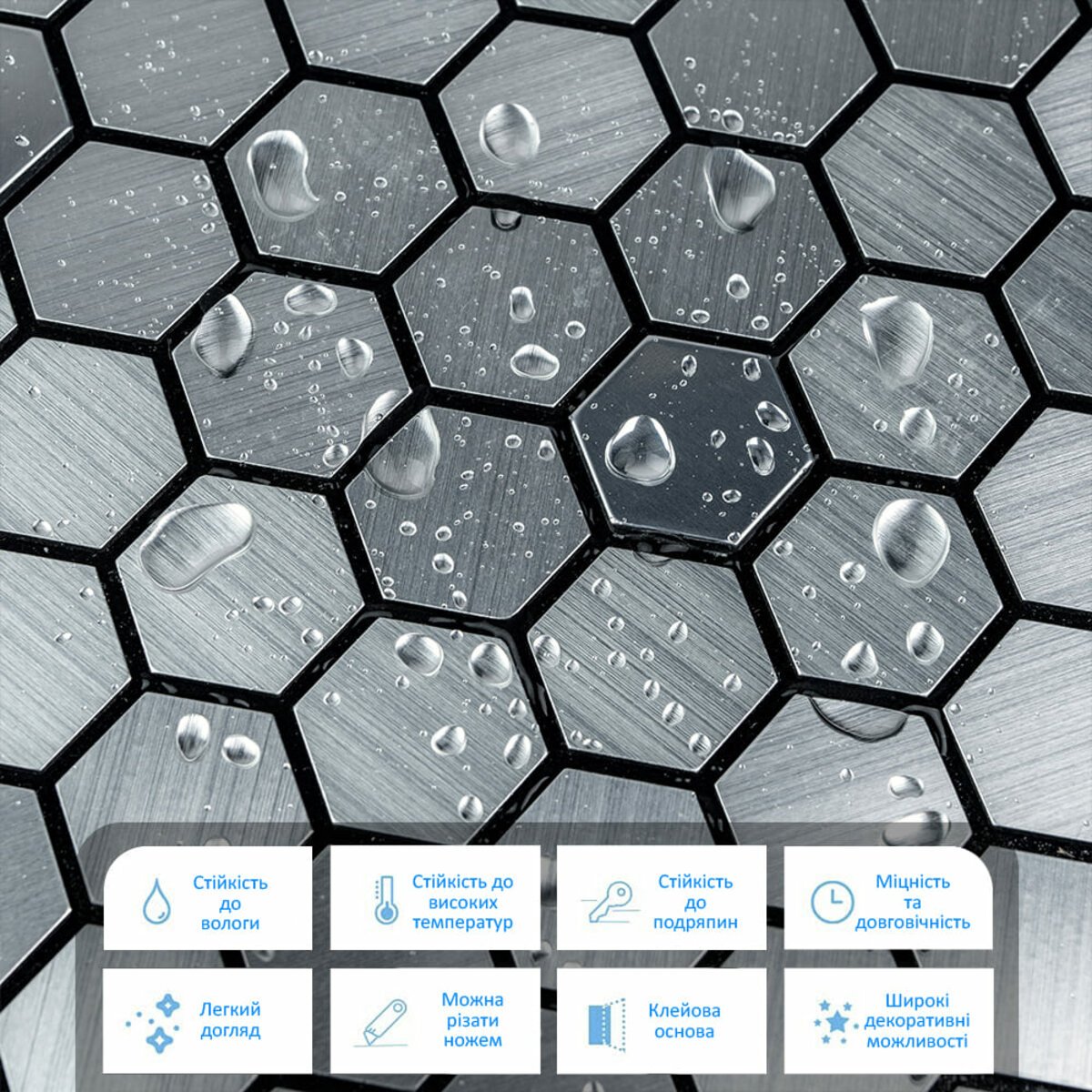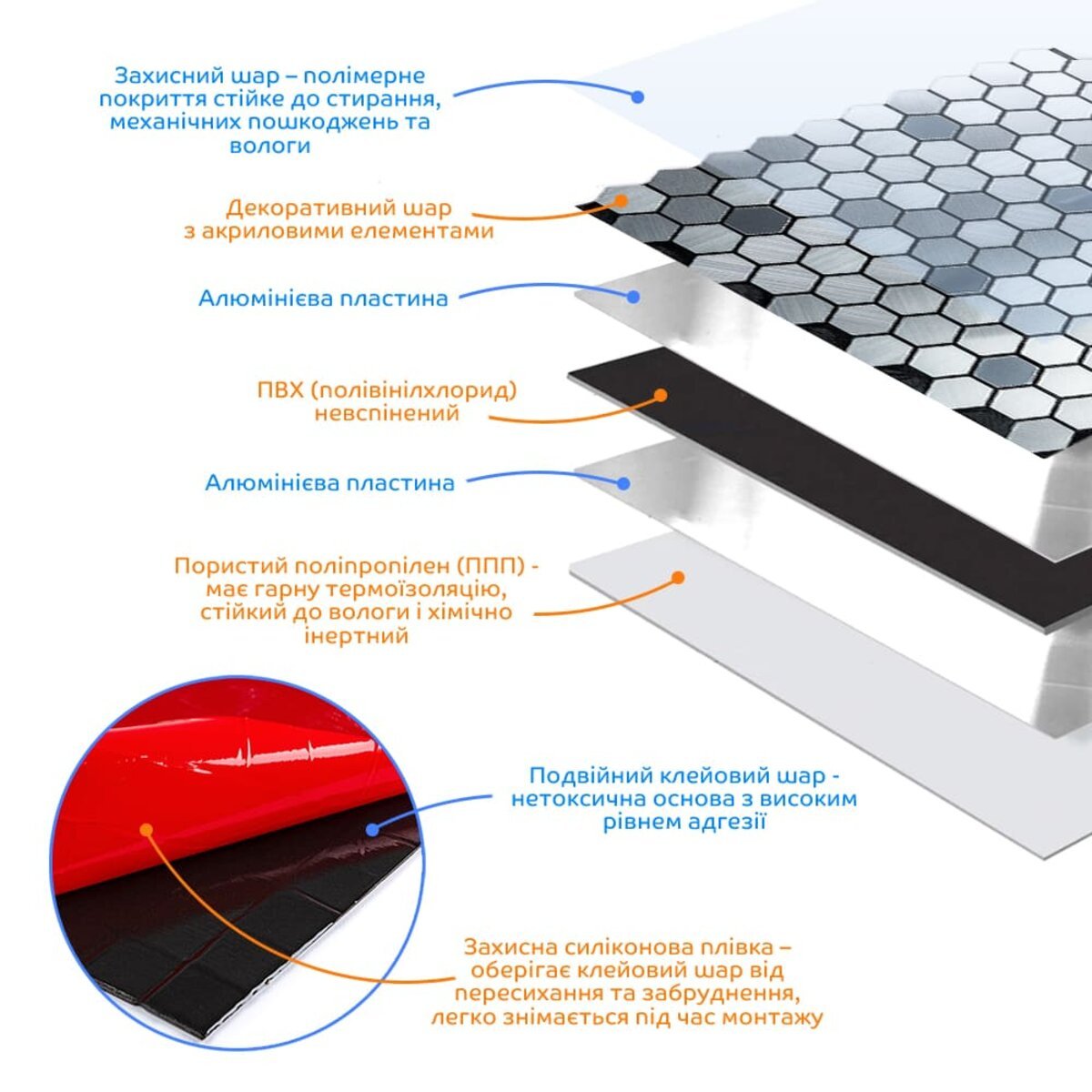 - Захисний силіконізований папір: захищає клейовий шар від пересихання та забруднення, легко знімається під час монтажу.