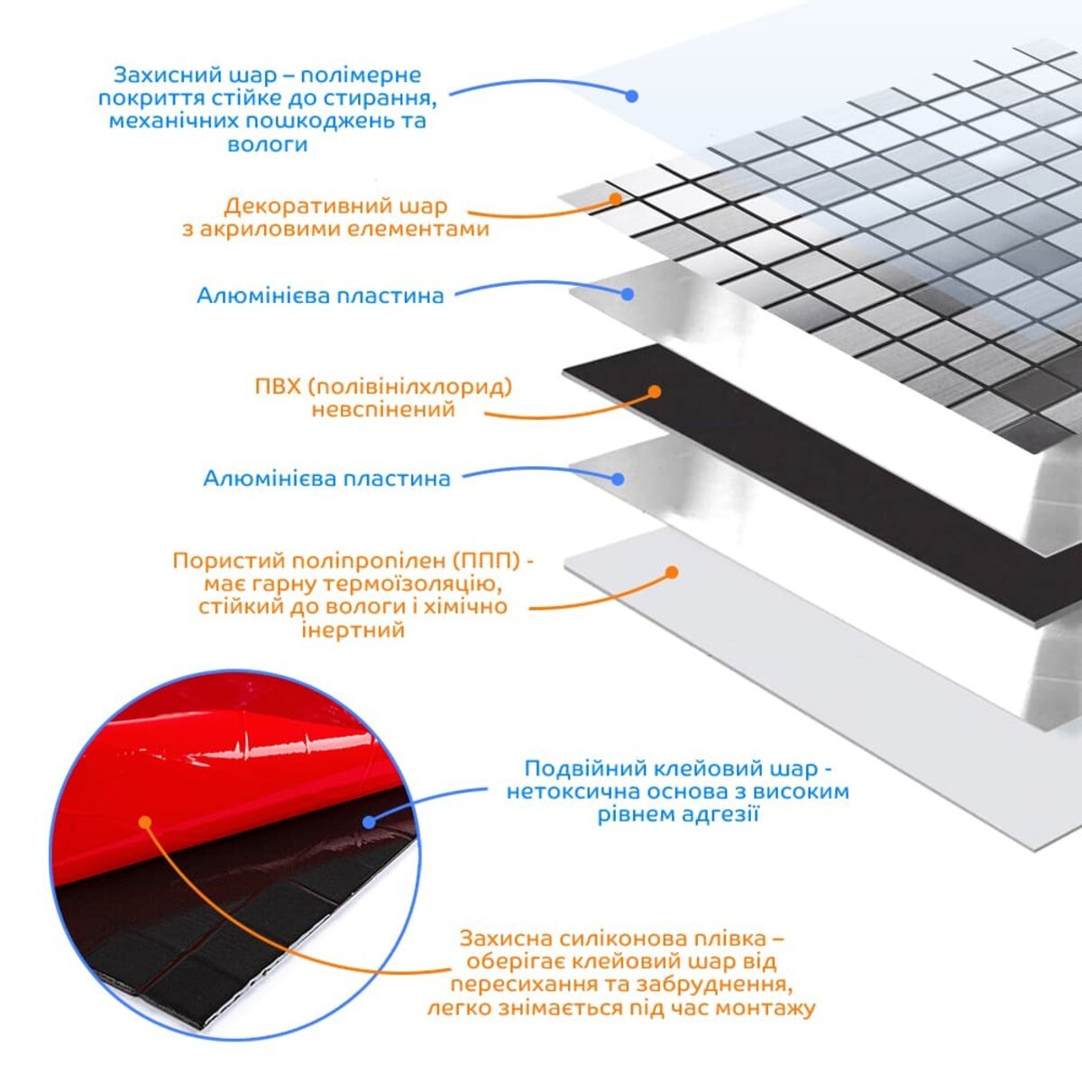 - Захисний силіконізований папір: захищає клейовий шар від пересихання та забруднення, легко знімається під час монтажу.
