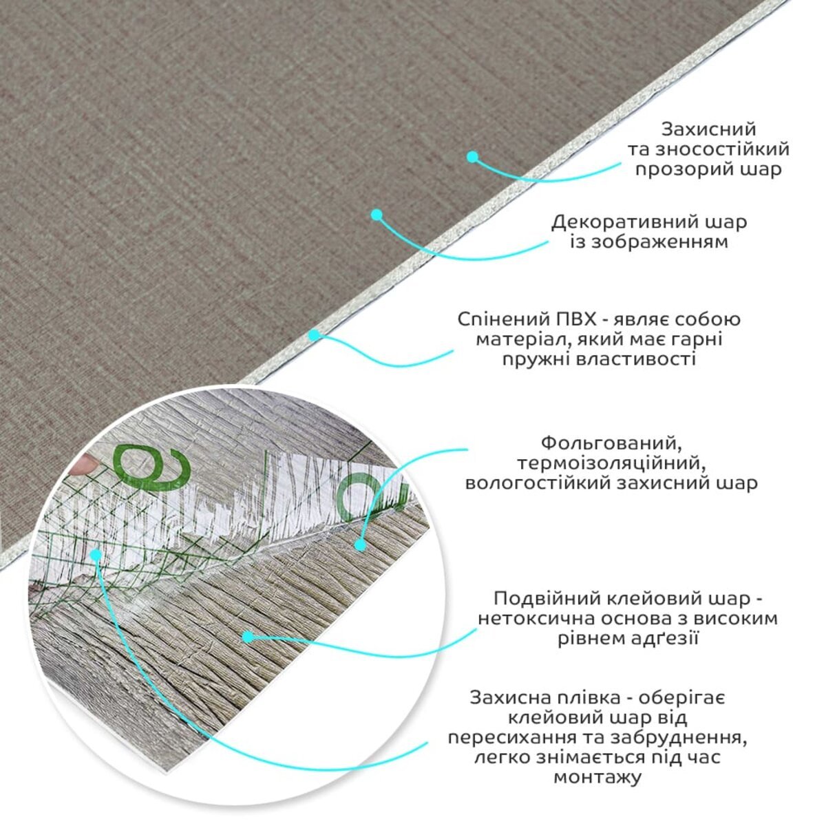 • Декоративний шар: плівка з кольоровим друком високої роздільної здатності, яка повністю імітує фактуру природних матеріалів завдяки чіткому та детальному зображенню.