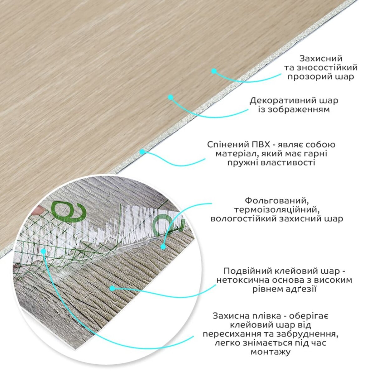 • Декоративний шар: плівка з кольоровим друком високої роздільної здатності, яка повністю імітує фактуру природних матеріалів завдяки чіткому та детальному зображенню.
