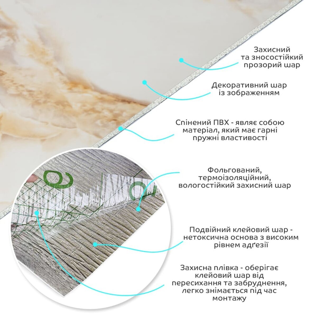 Захисна плівка – оберігає клейовий шар від пересихання та забруднення, легко знімається під час монтажу.