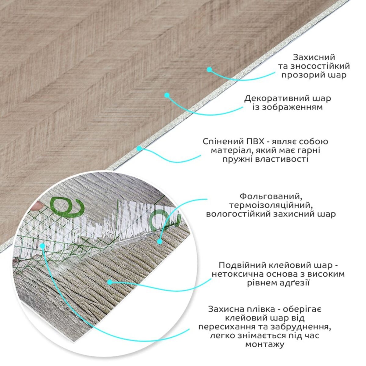 • Декоративний шар: плівка з кольоровим друком високої роздільної здатності, яка повністю імітує фактуру природних матеріалів завдяки чіткому та детальному зображенню.