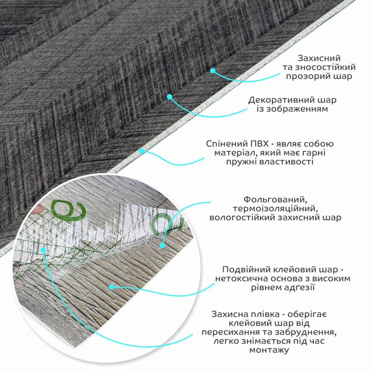 • Декоративний шар: плівка з кольоровим друком високої роздільної здатності, яка повністю імітує фактуру природних матеріалів завдяки чіткому та детальному зображенню.