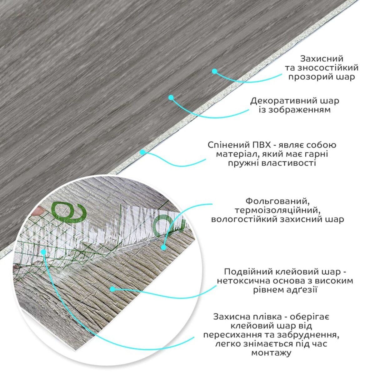 • Декоративний шар: плівка з кольоровим друком високої роздільної здатності, яка повністю імітує фактуру природних матеріалів завдяки чіткому та детальному зображенню.
