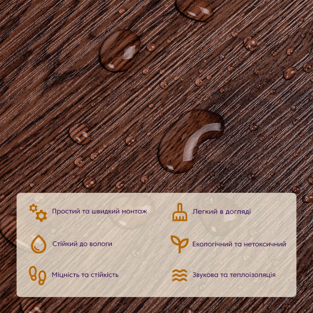 • Стійкість до вологи: вінілова плитка під ламінат стійка до вологи, що робить її відмінним вибором для кухні та інших приміщень з підвищеною вологістю, матеріал стійкий також до впливу пари та до появи плісняви.