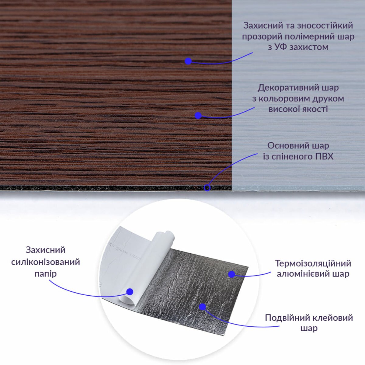 • Декоративний шар: плівка з кольоровим друком високої якості, яка повністю імітує фактуру природних матеріалів завдяки чіткому та деталізованому зображенню.