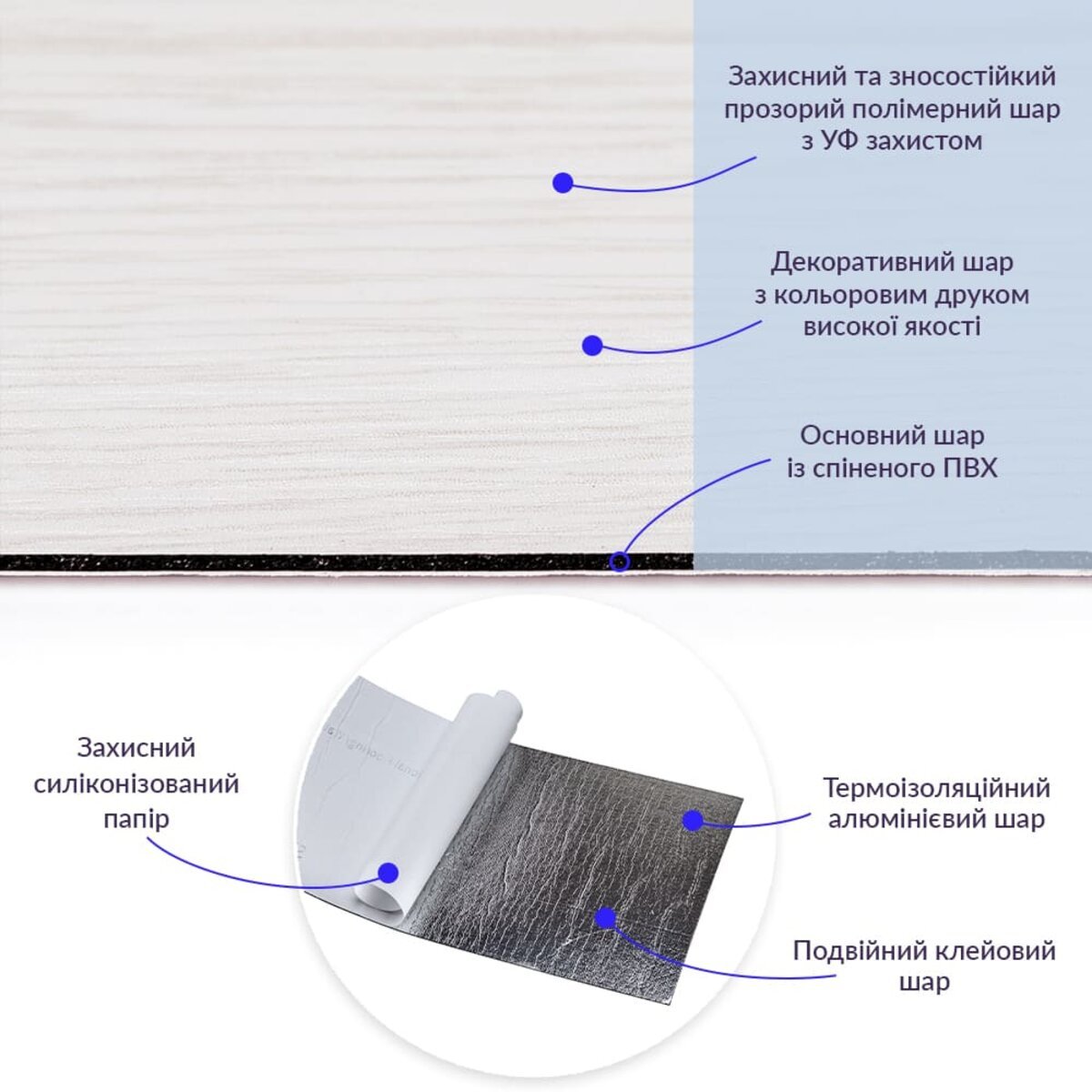 Декоративний шар: плівка з кольоровим друком високої якості, яка повністю імітує фактуру природних матеріалів завдяки чіткому та деталізованому зображенню.