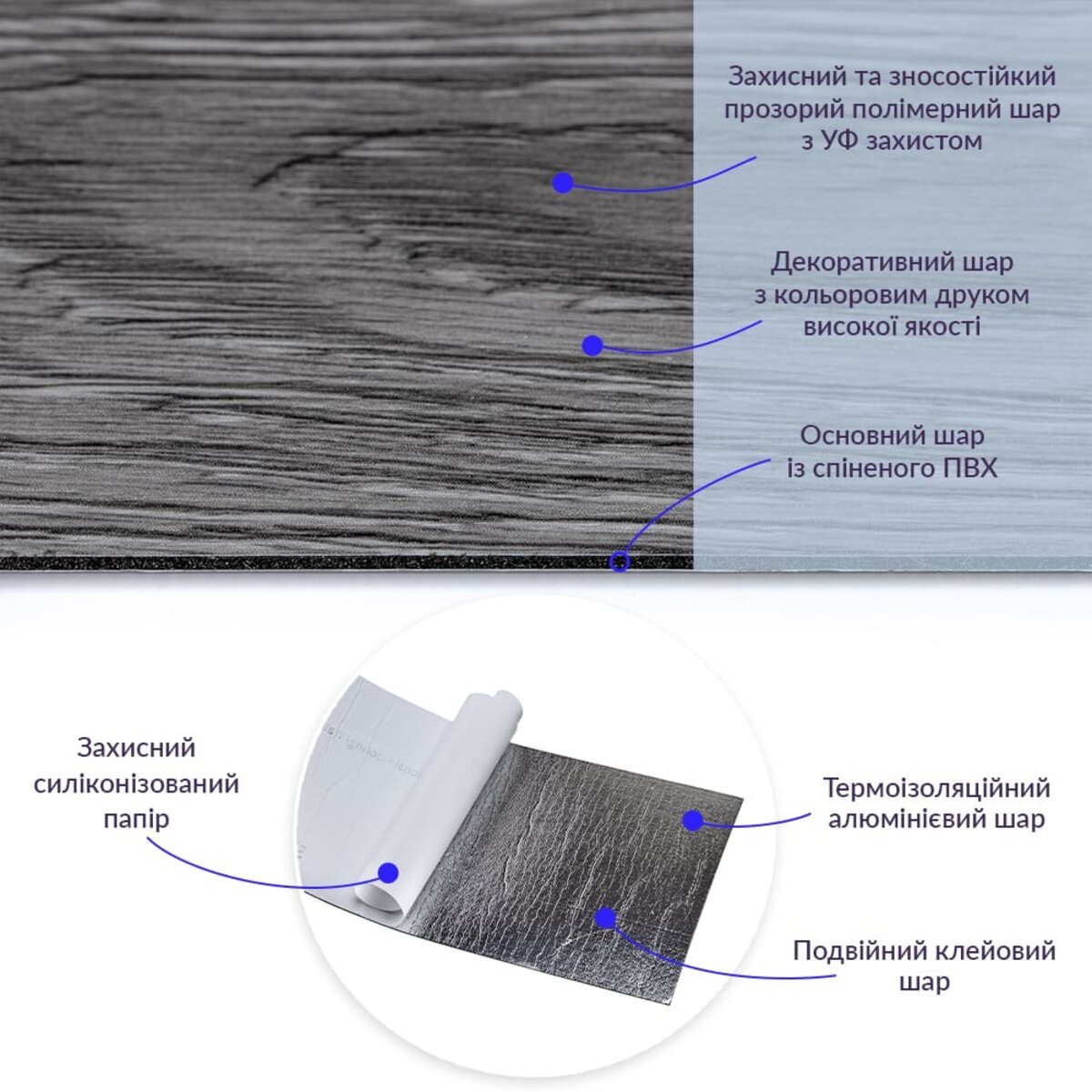 Декоративний шар: плівка з кольоровим друком високої якості, яка повністю імітує фактуру природних матеріалів завдяки чіткому та деталізованому зображенню.